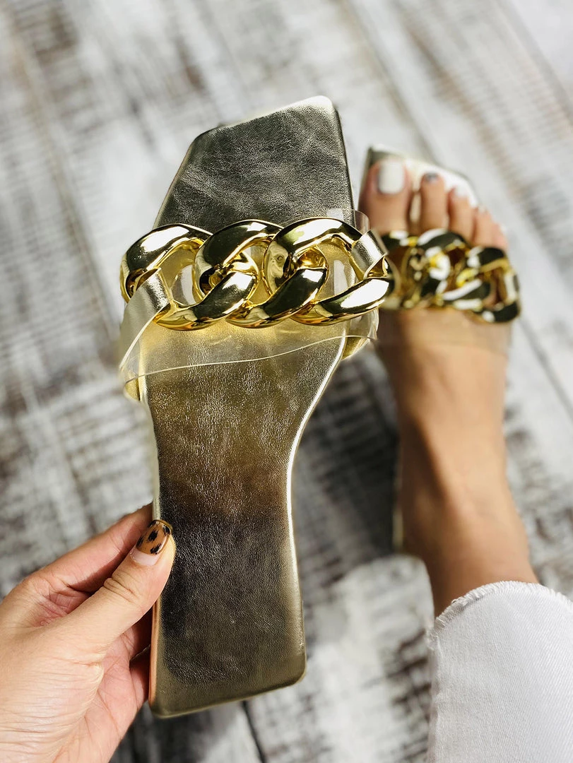 Elevate your sunny-day ensemble with these slip-on sandals crafted with a trendy chain accent and durable rubber soles.