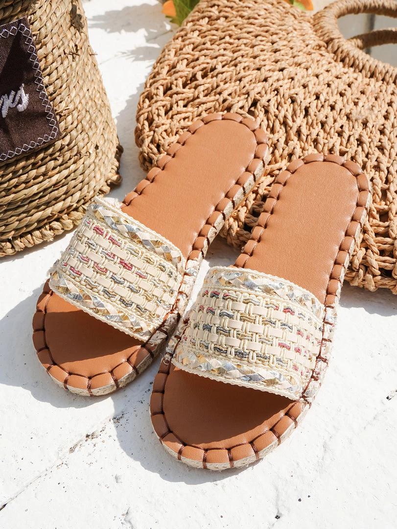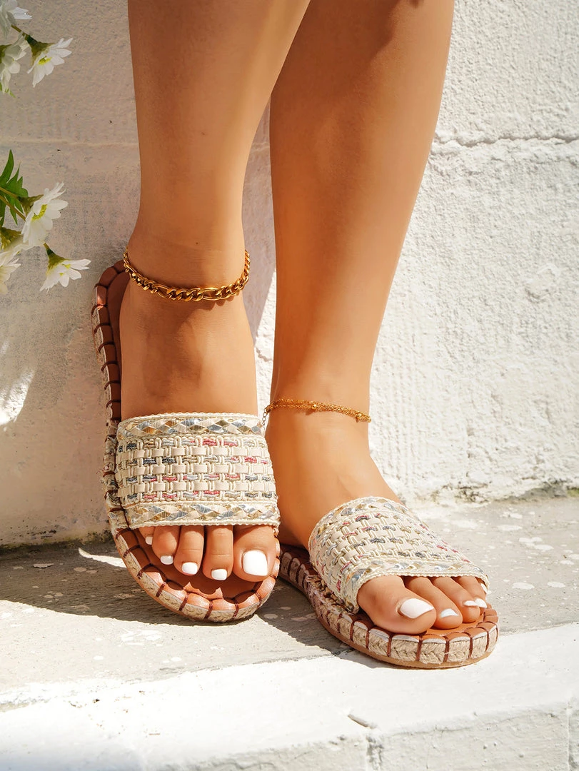 Add a pop of color to your warm-weather looks with these elegant slides featuring an embroidered woven pattern.