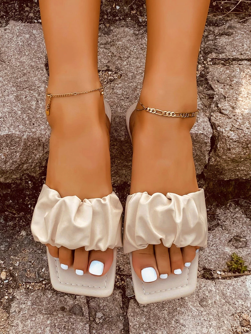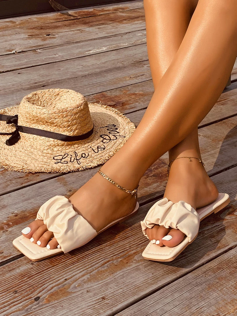 Put your fashionable foot forward in this easy-on slides featuring a ruffled upper for stylishly warm-weather wear.