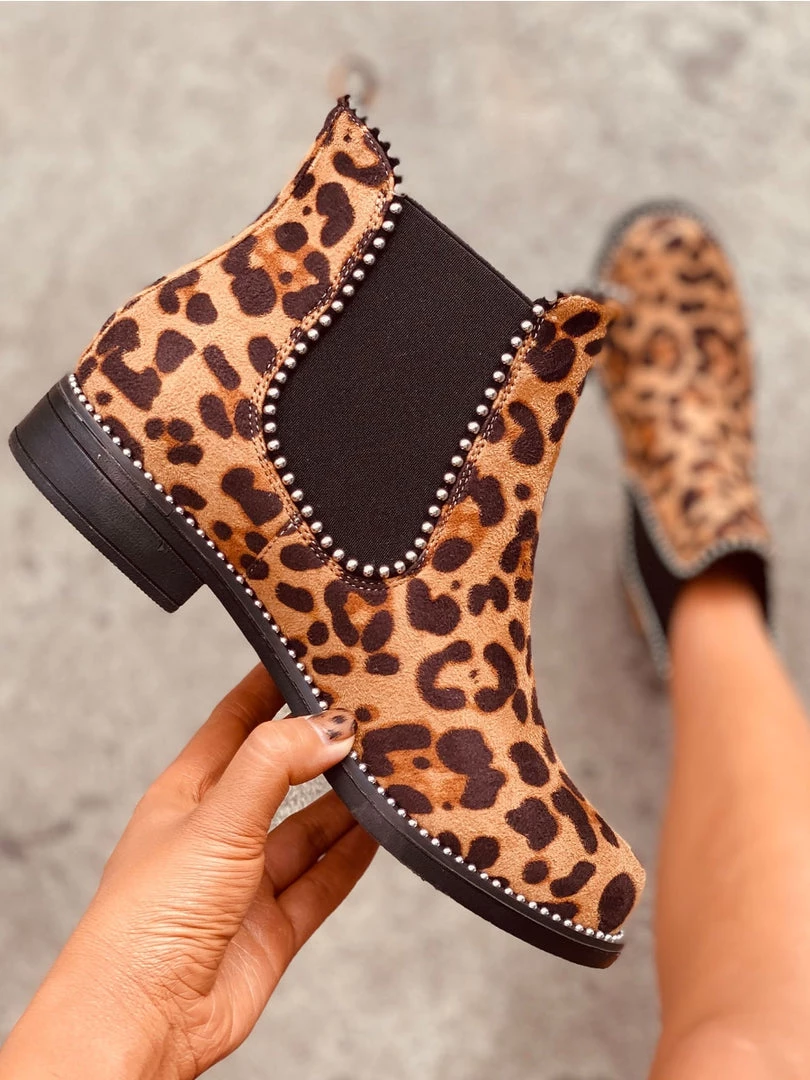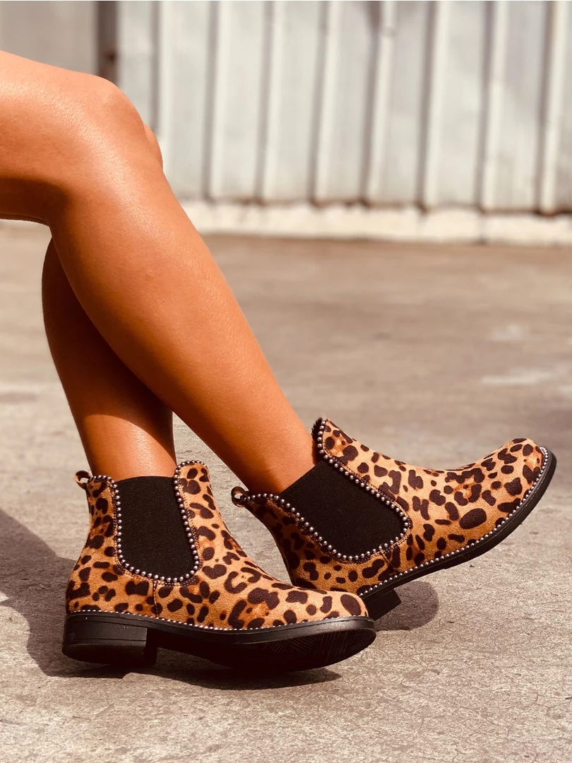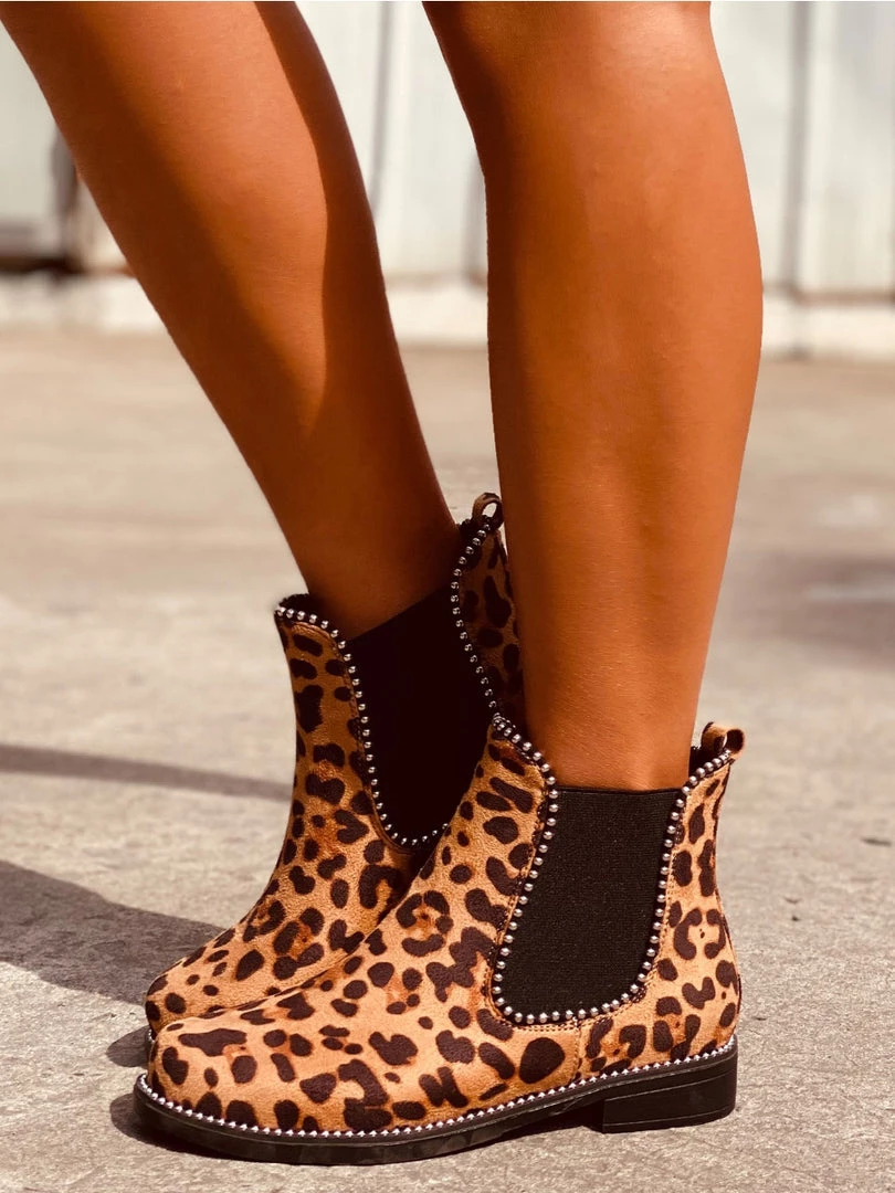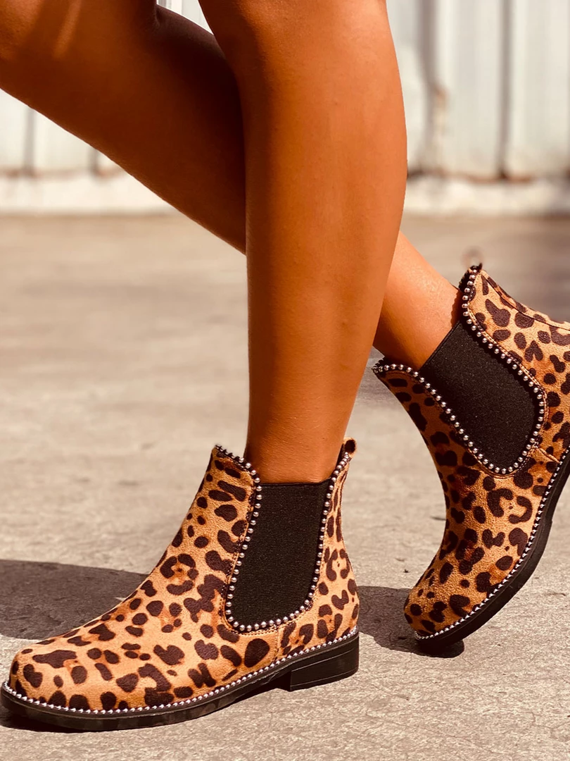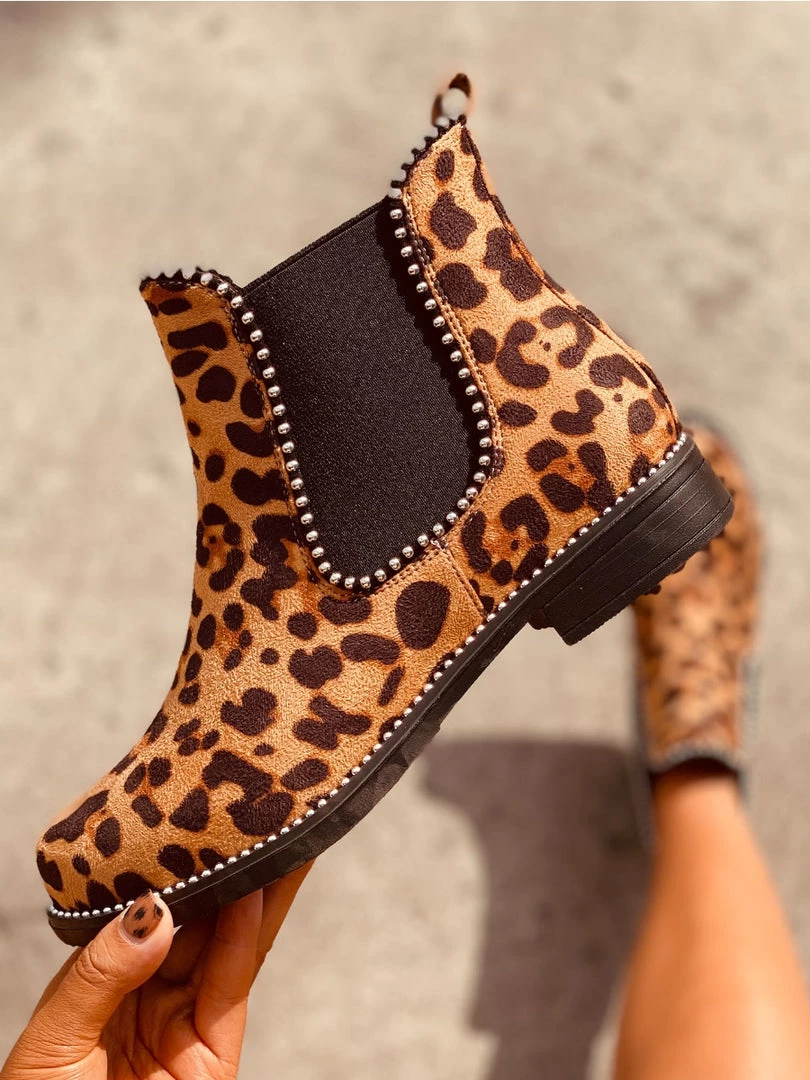Dress up his casual walk in this sleek animal print Chelsea boot that features a studded trim and toothy traction sole for extra grip.