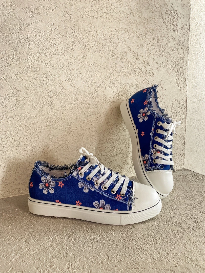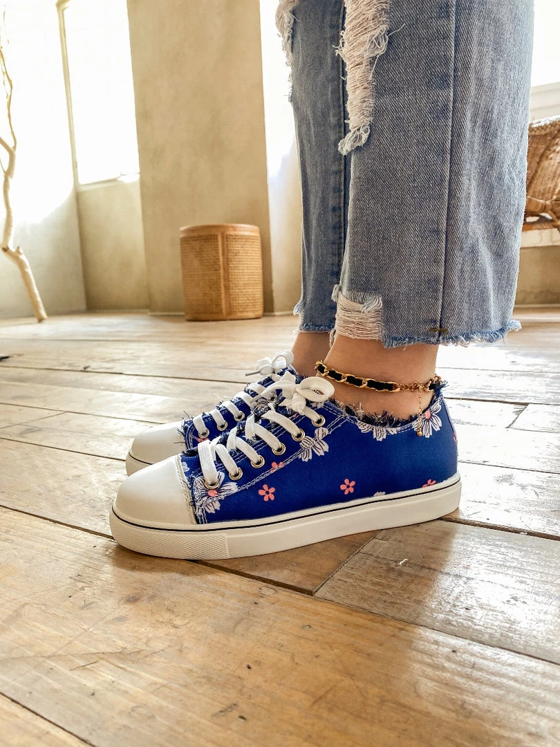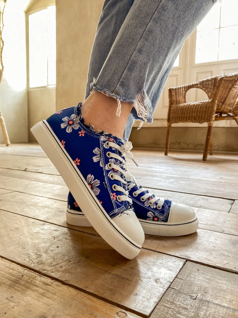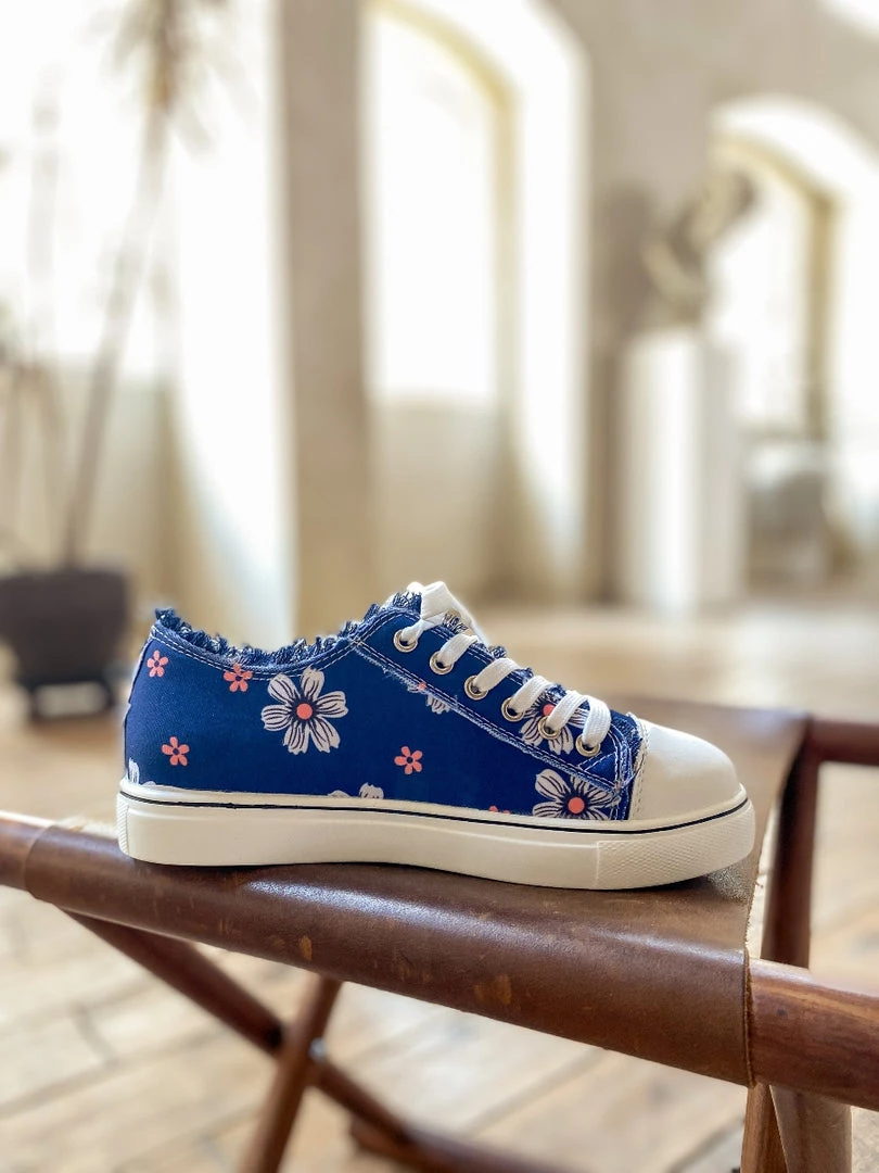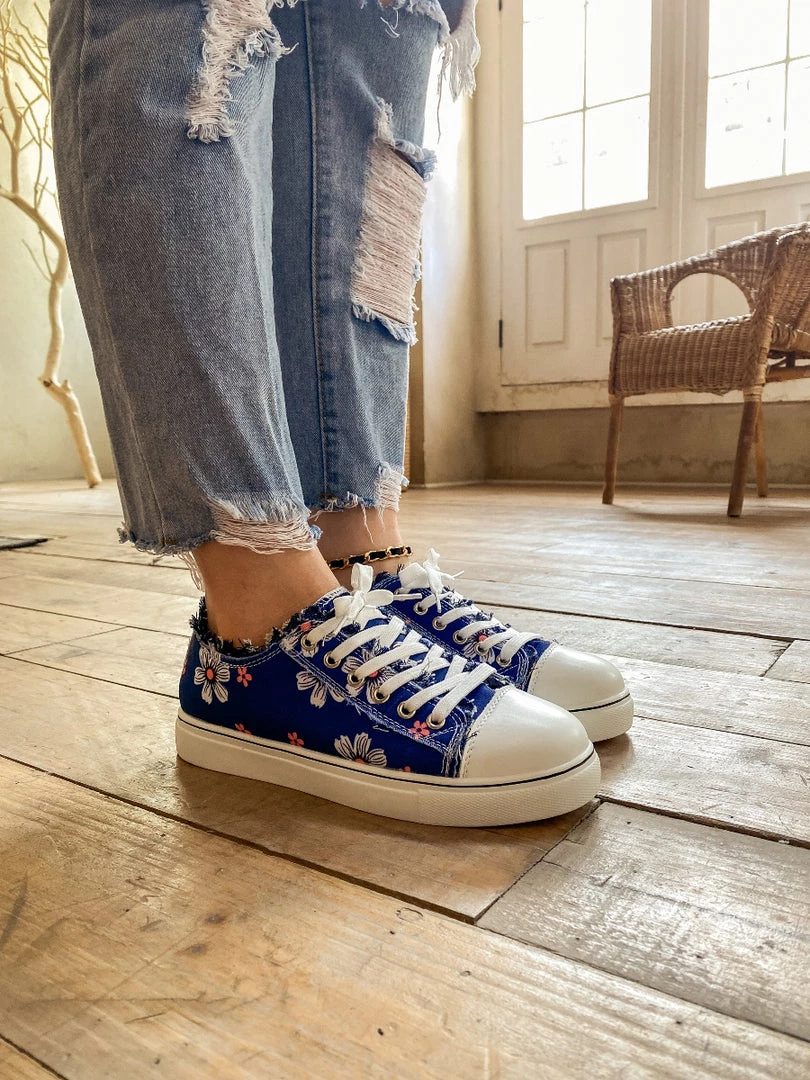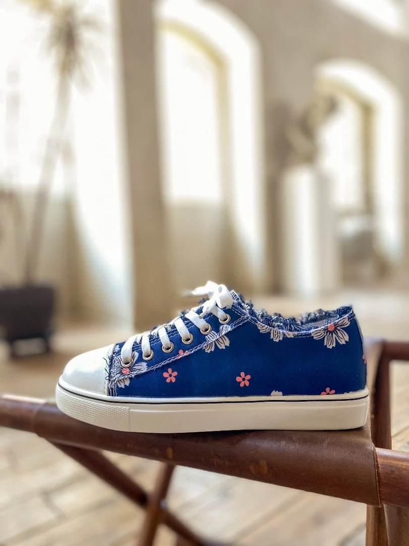 With a canvas-inspired design and slight lace-up detail, this blossom print sneaker shoe provides chic style to your casual looks with it’s ripped details.