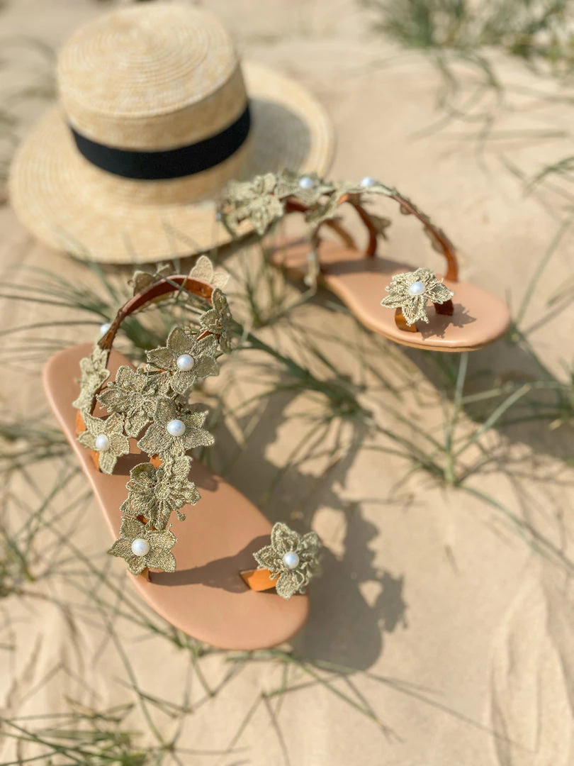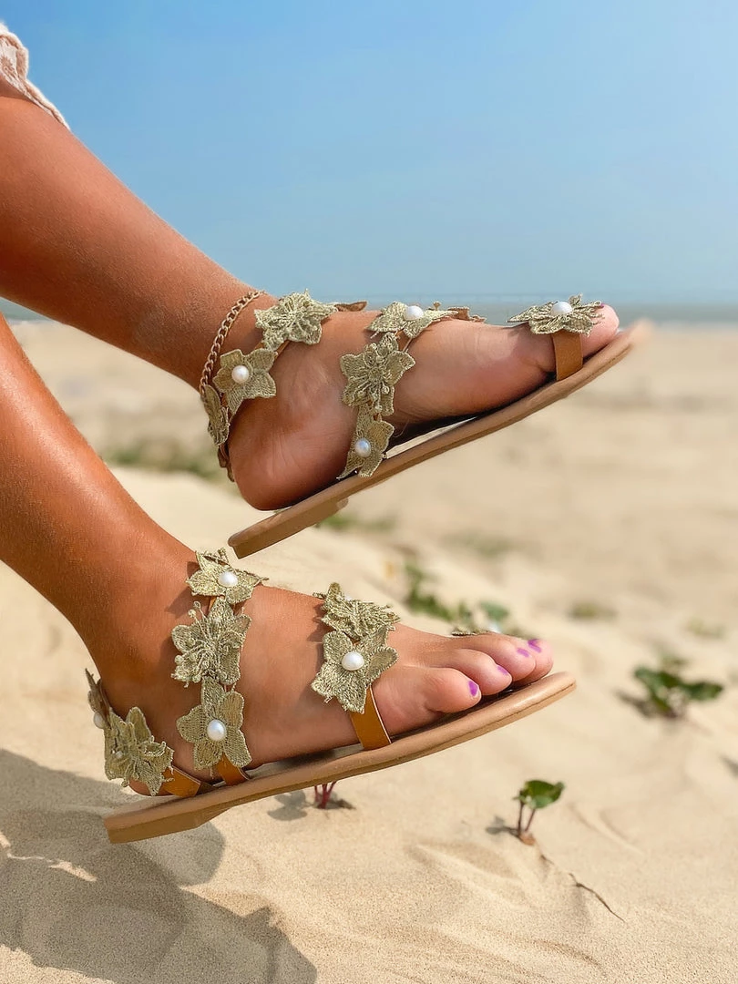 An embroidered flower strap hugs your ankles when you don this sandal. The skid-resistant sole keeps your steps secure.