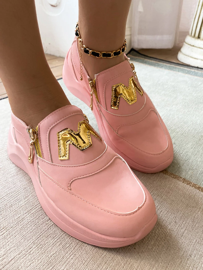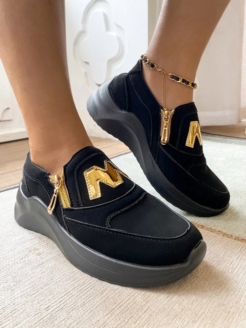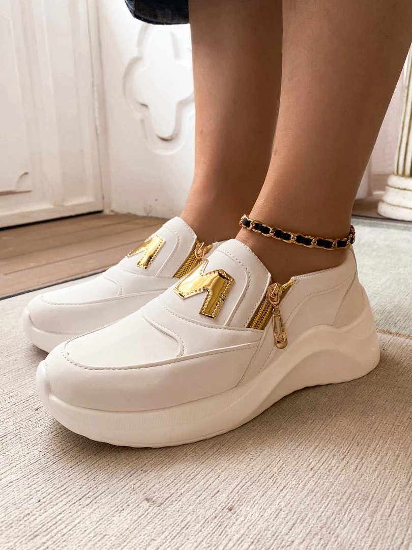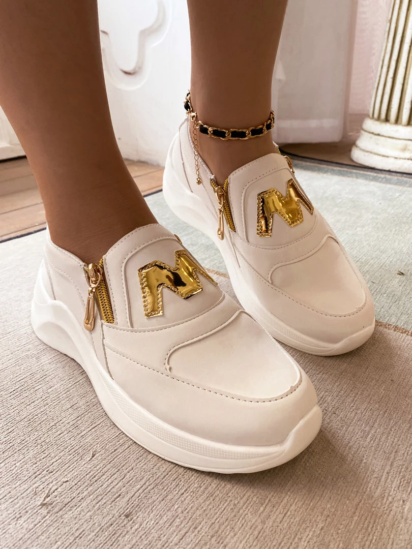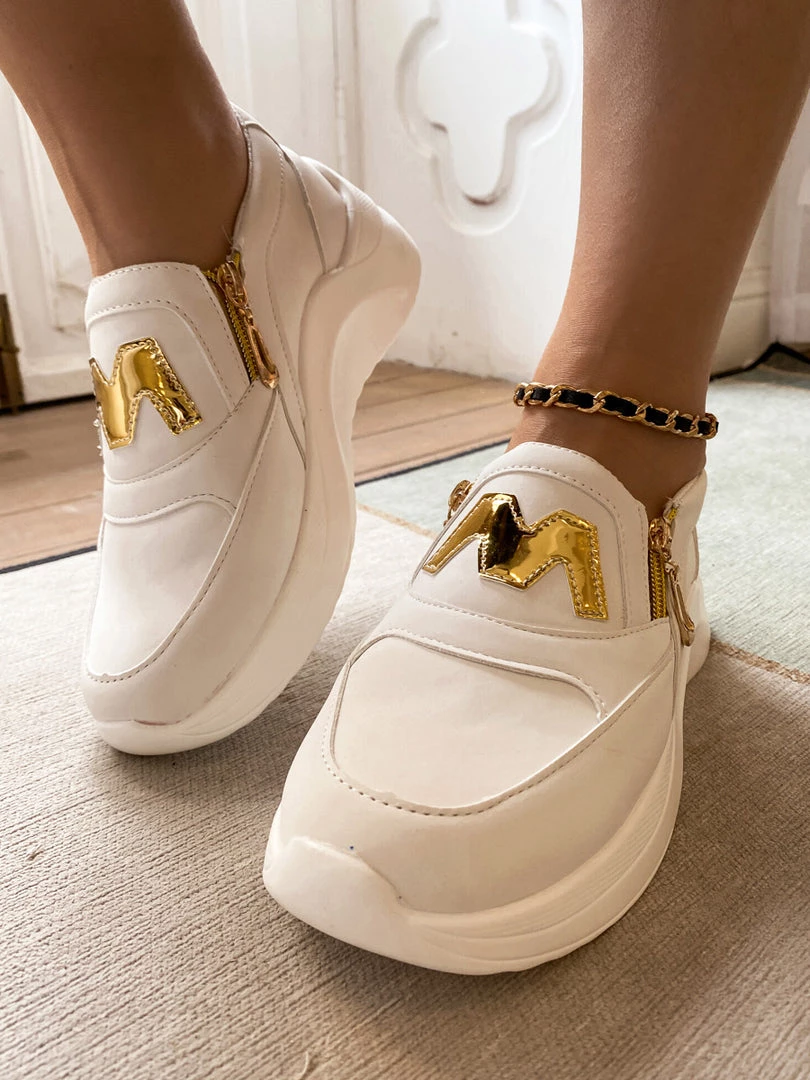 Finish your casual-chic ensemble with this slip-on sneaker boasting a M Logo design with gold tone side zip closure.