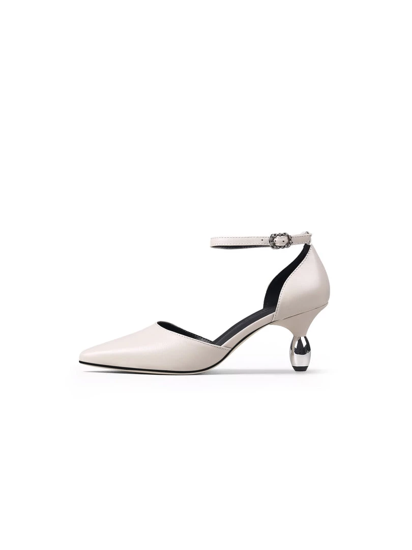 A shimmering textured heel adds modern allure to these classic leather ankle strap heel.