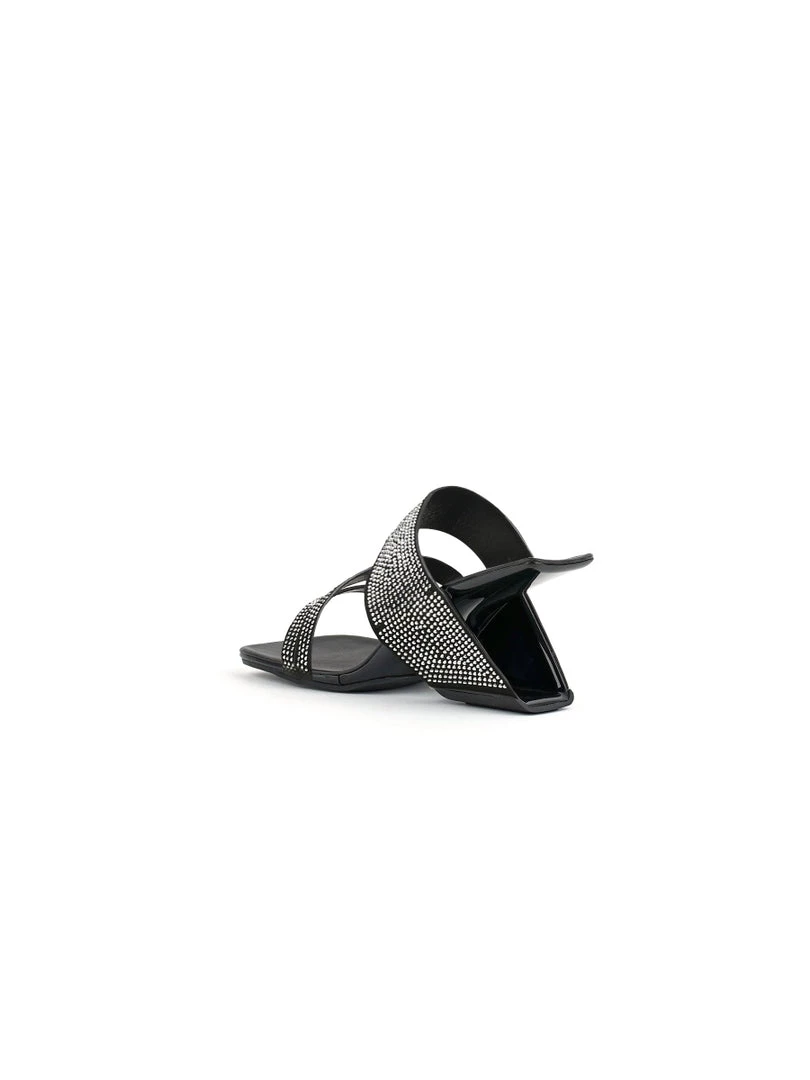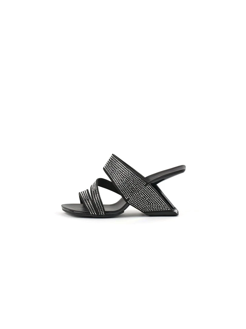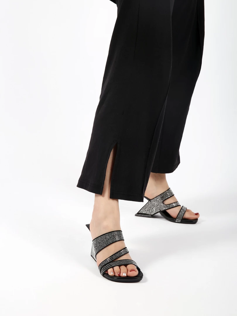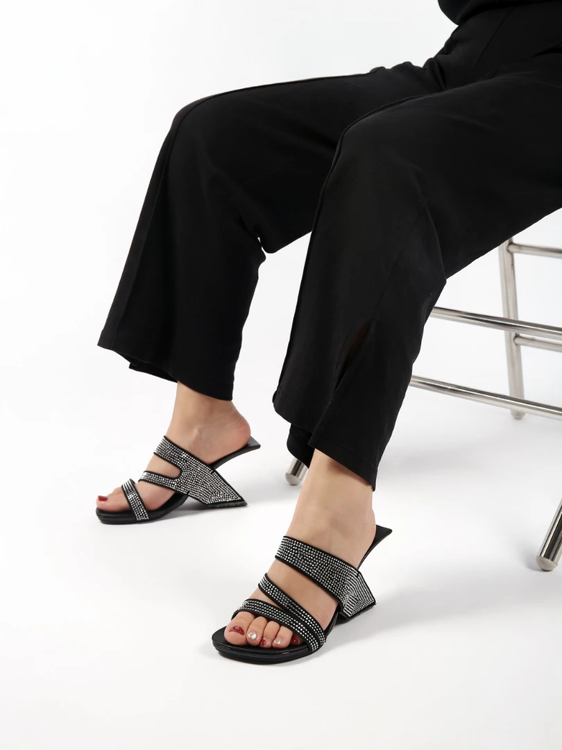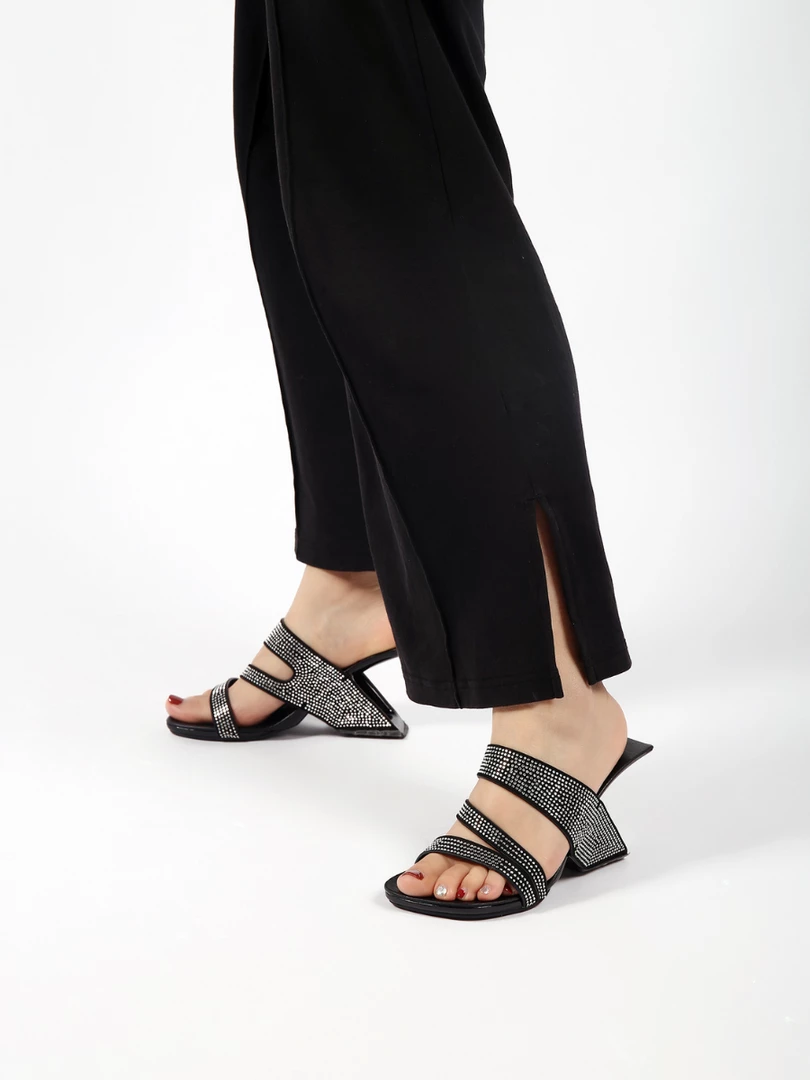 Our Amadea Heel comes in an elegant black tone. This features an asymmetric strap upper and rhinestone all over that makes this heel look elegant! This pairs beautifully with our party dress for a night out with the girls! .