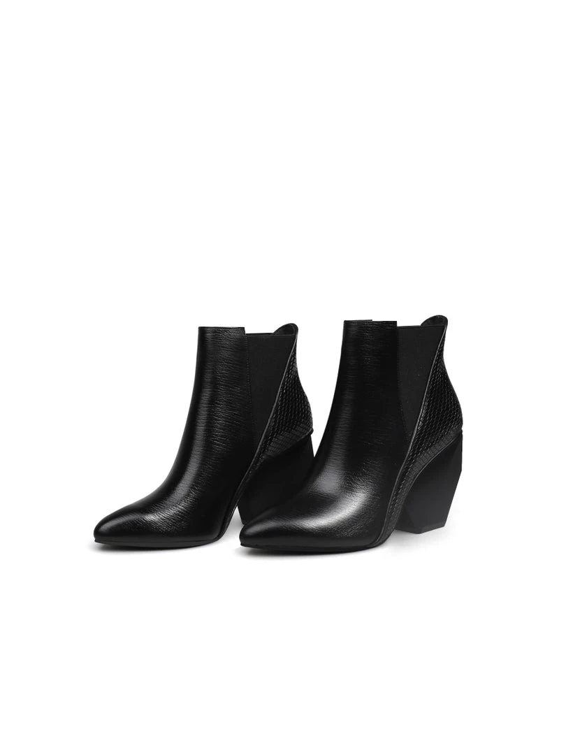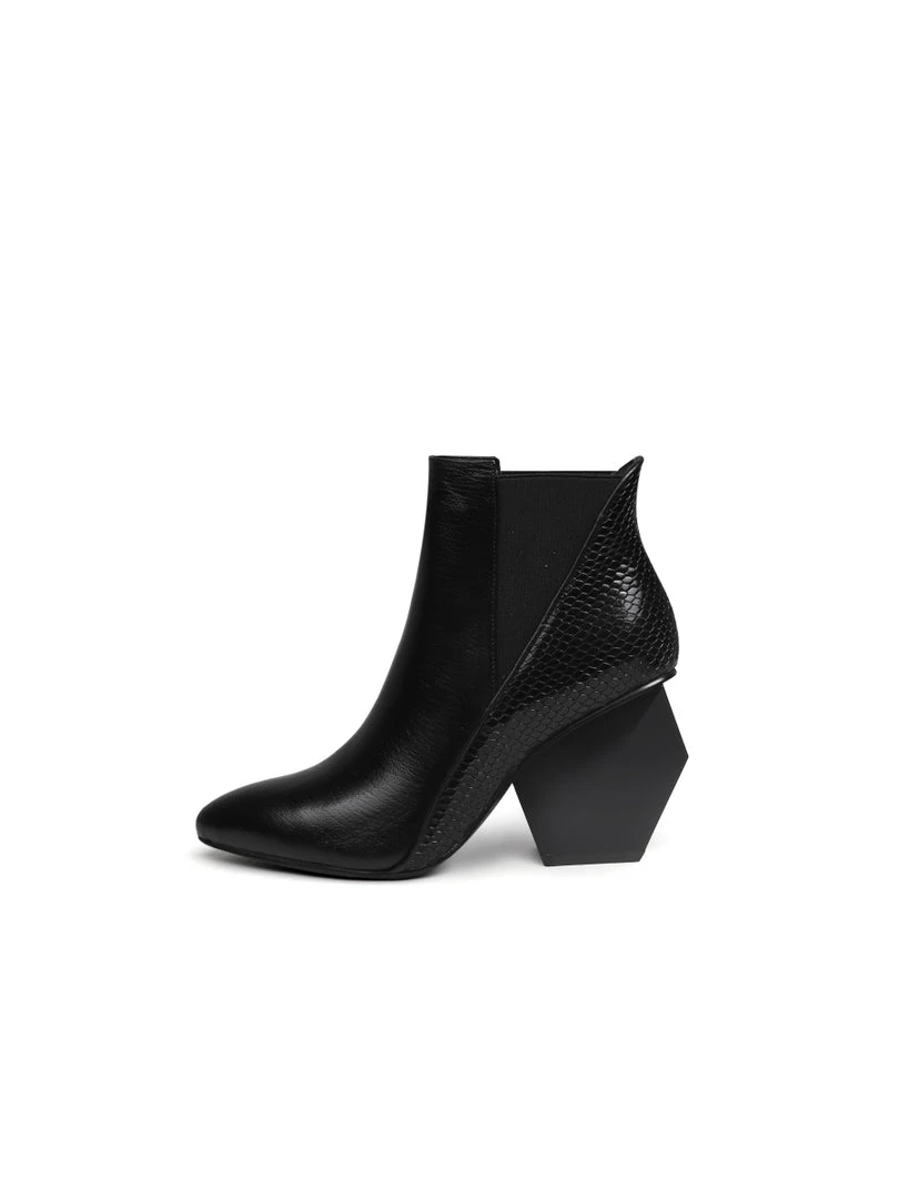 You’ll be fielding the question, ”Where did you get those booties?” over and over again when you step out in style in these leather boot that have a sleek and block look with a unique, geometry heel.