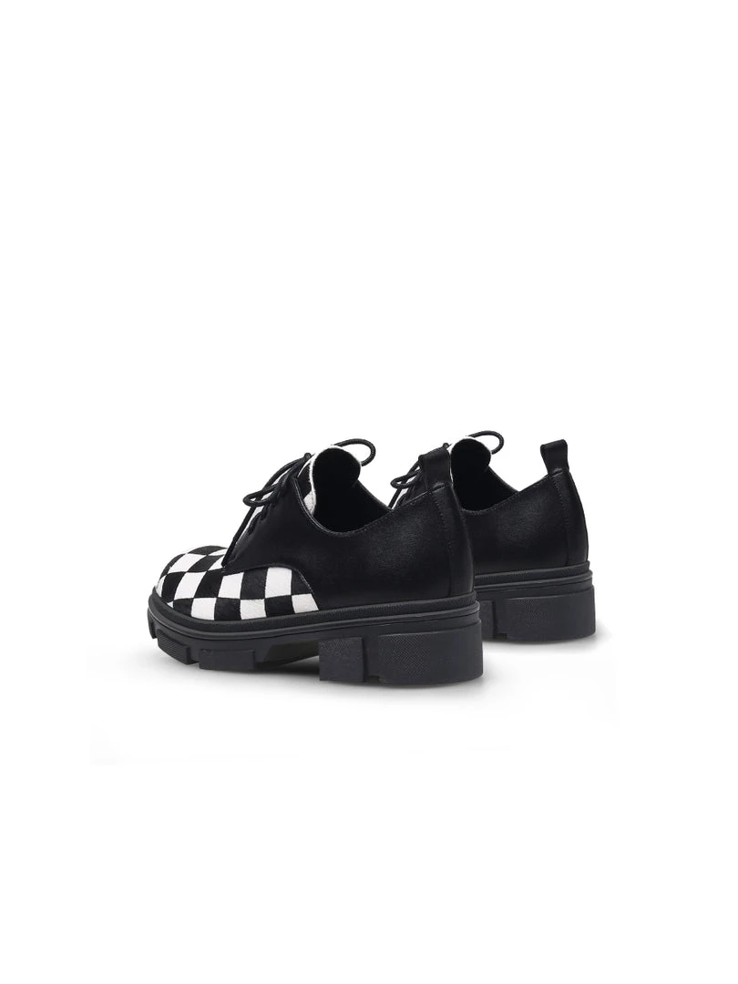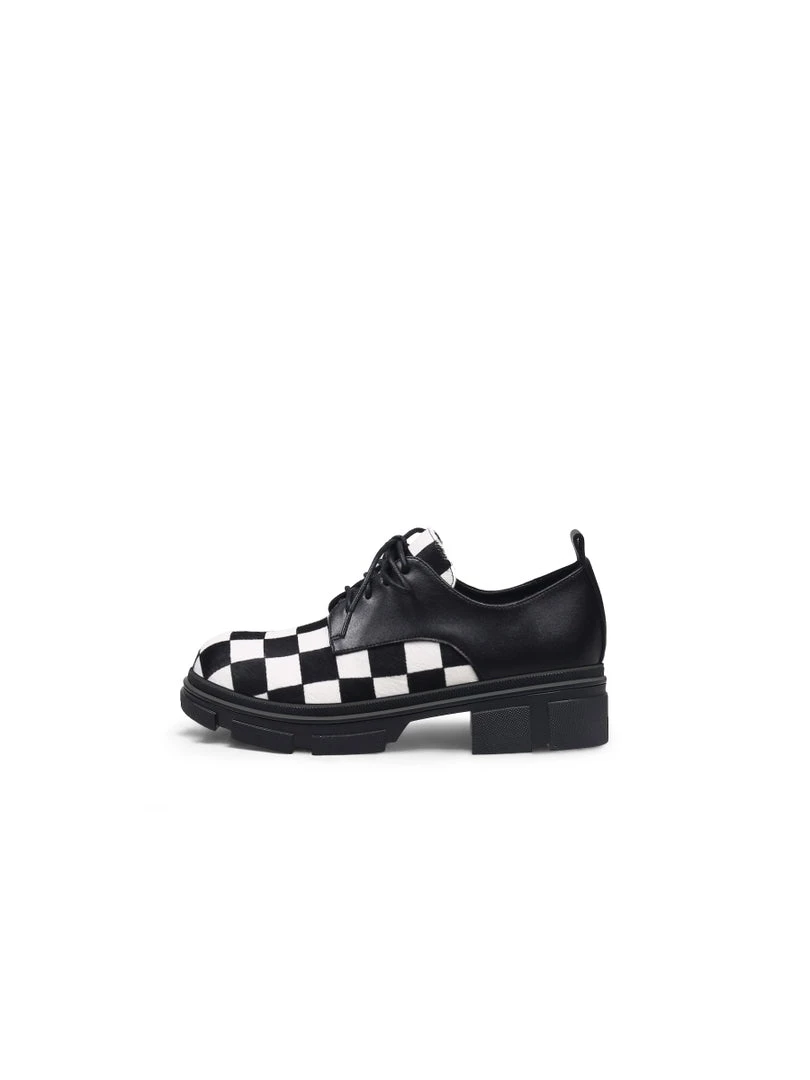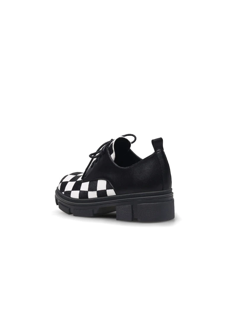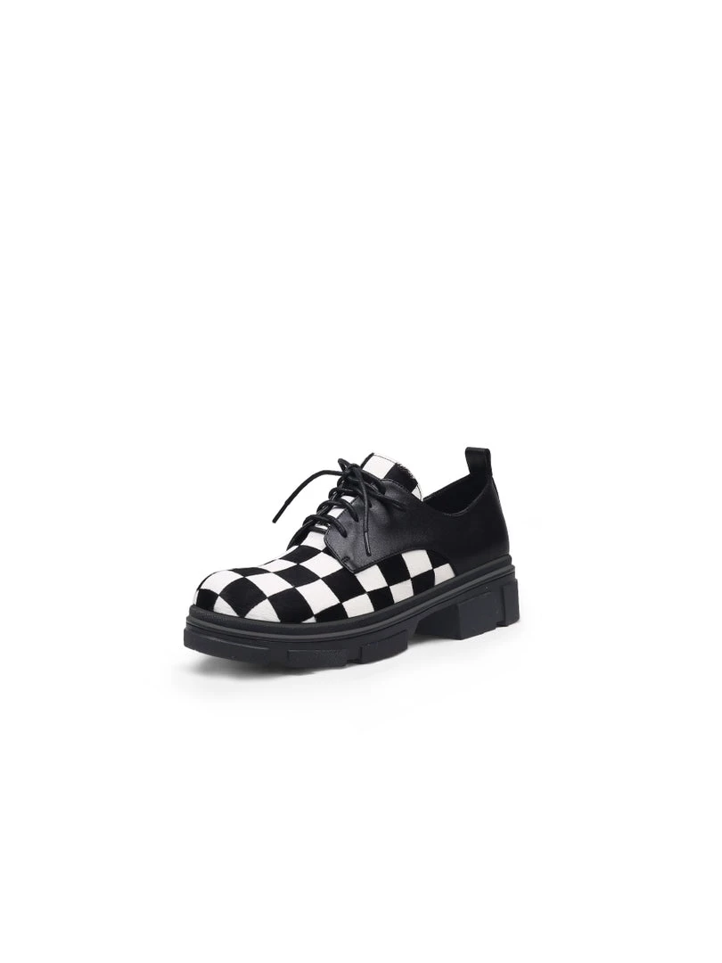 Borrow from a classic menswear look with these oxfords that have a lace-up entry and chess pattern matte genuine leather upper.