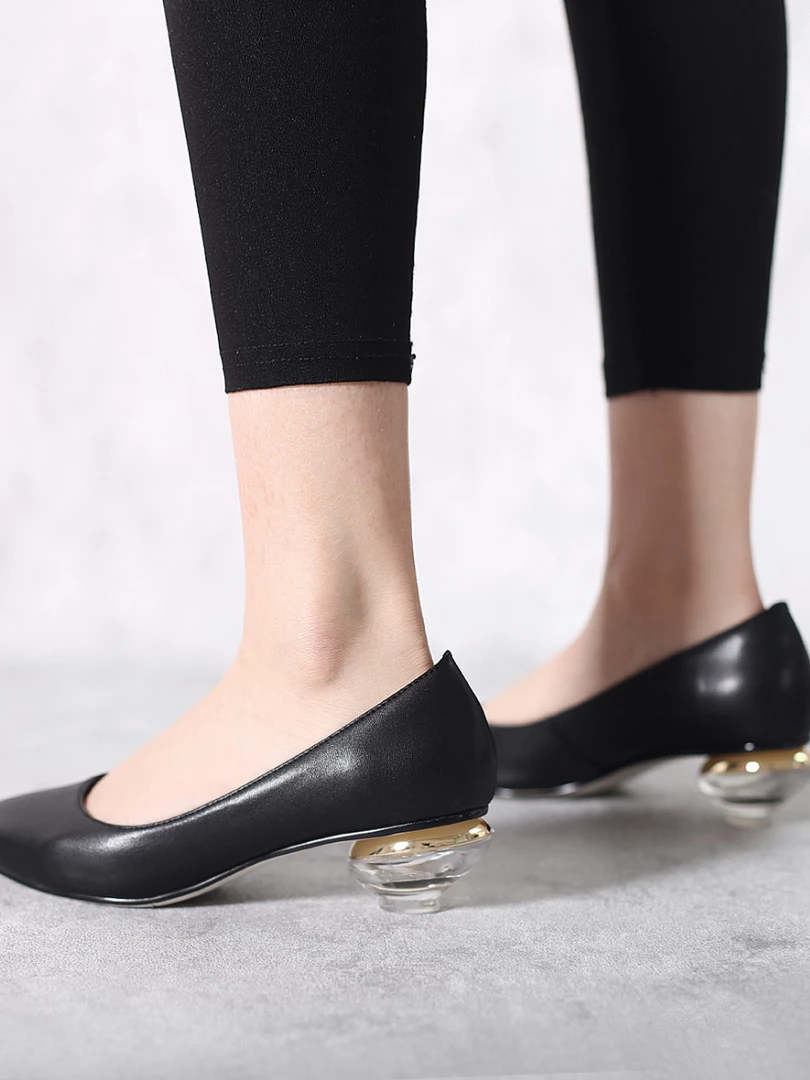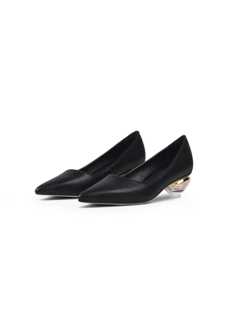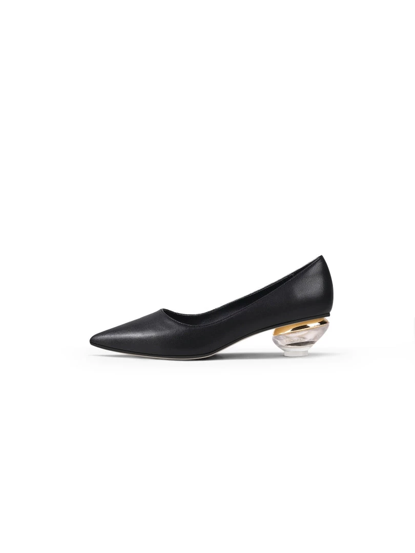 A shimmering textured heel adds modern allure to these classic leather pump.