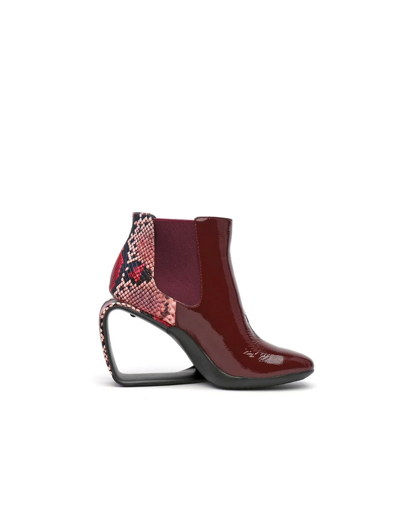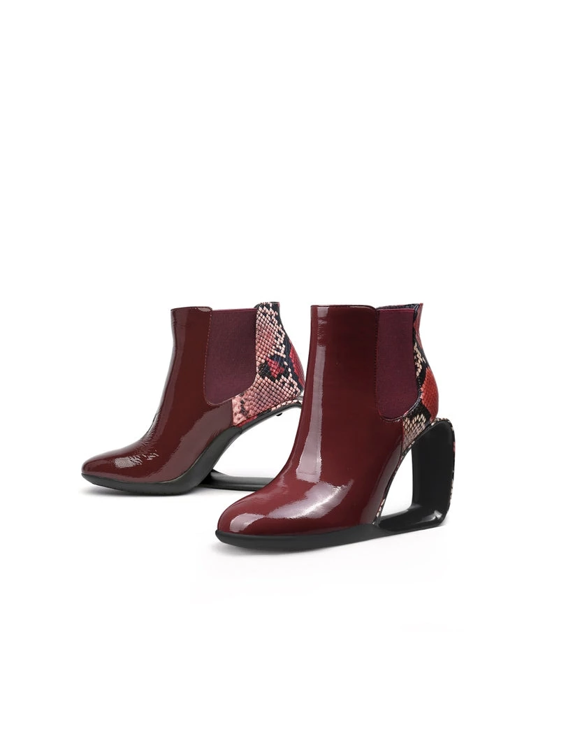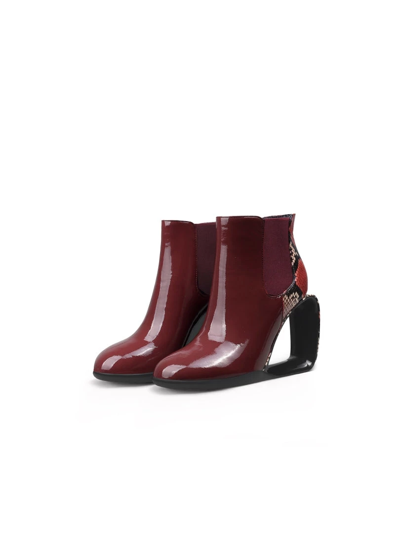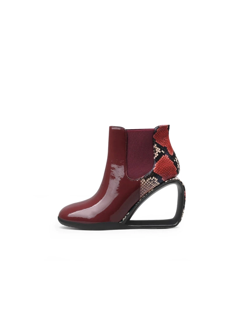 Elevate your shoe closet with this boot featuring a dazzling triangle shaped wedge-heel and shiny leopard finish for a complete sleek look.