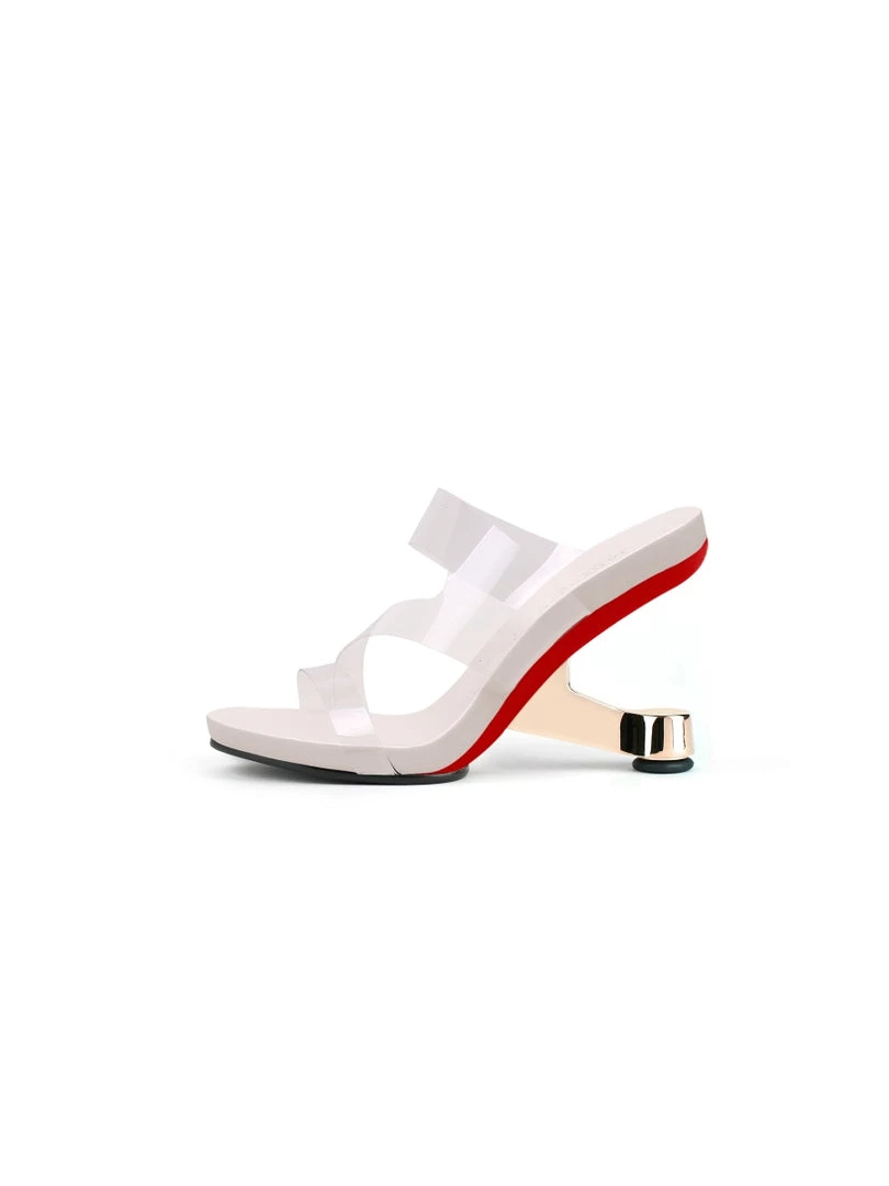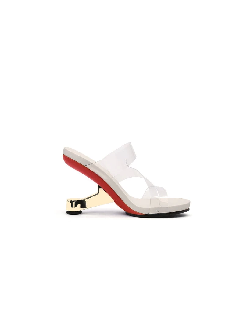 Add futuristic glamour to your ensemble with this golden elevator-heel slides with an elegant red sole at the bottom.