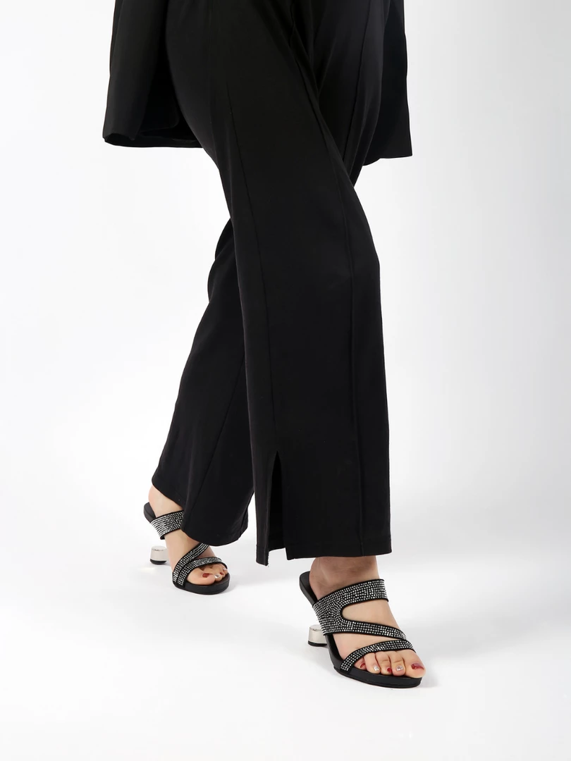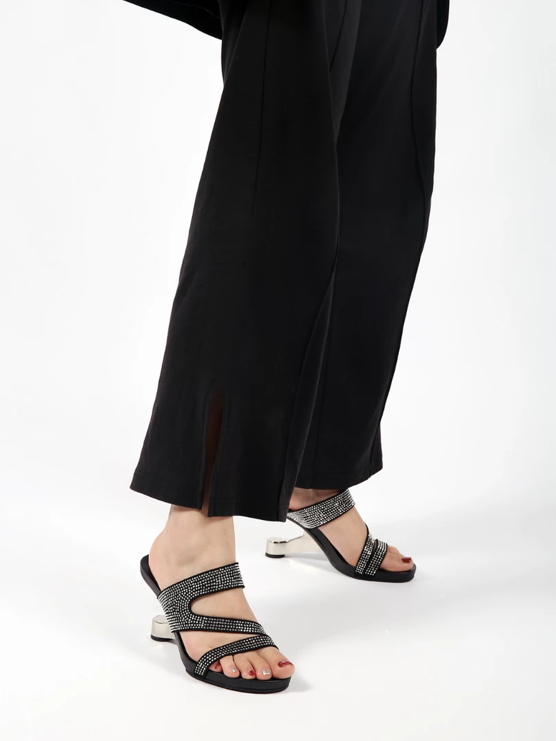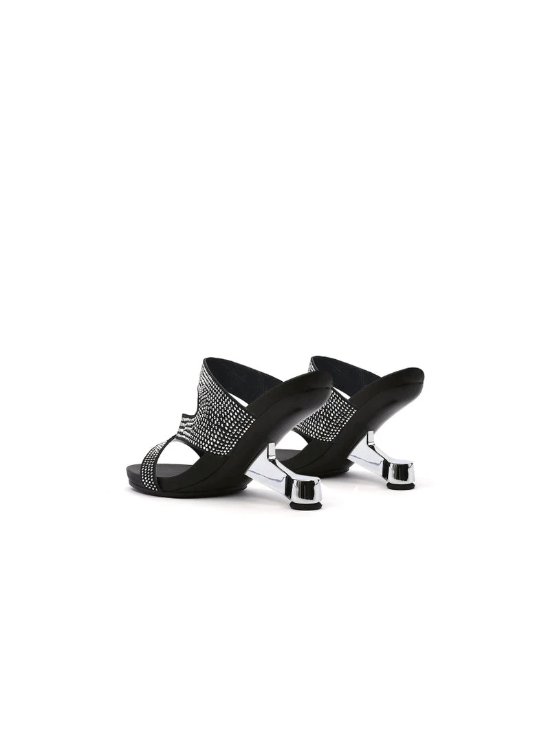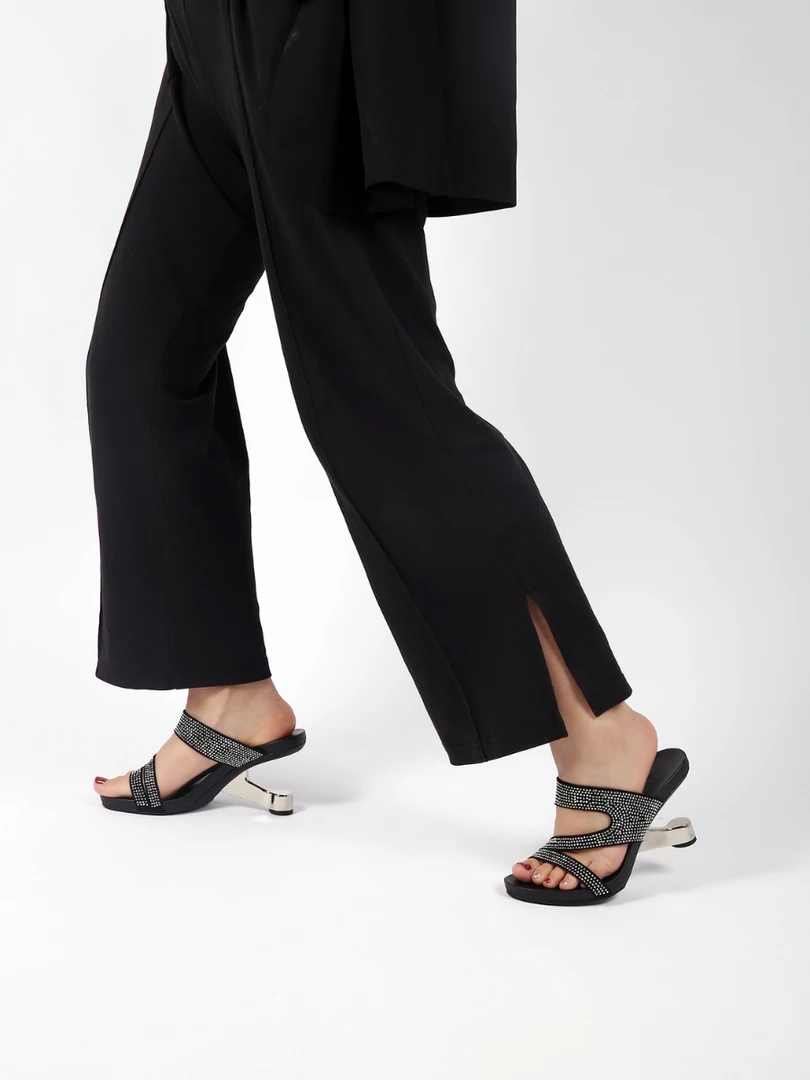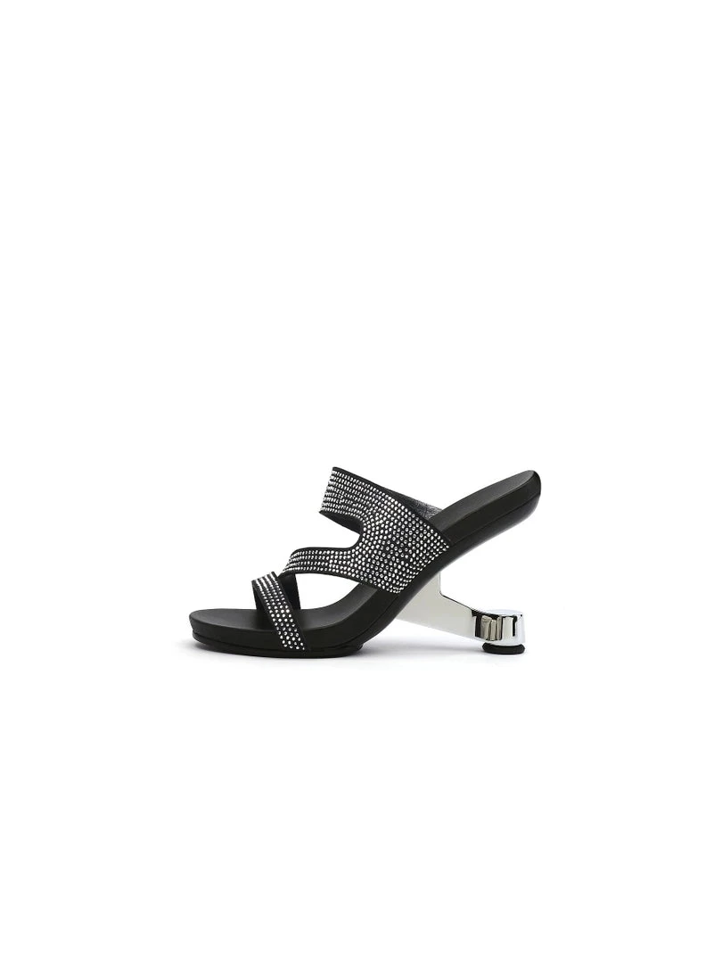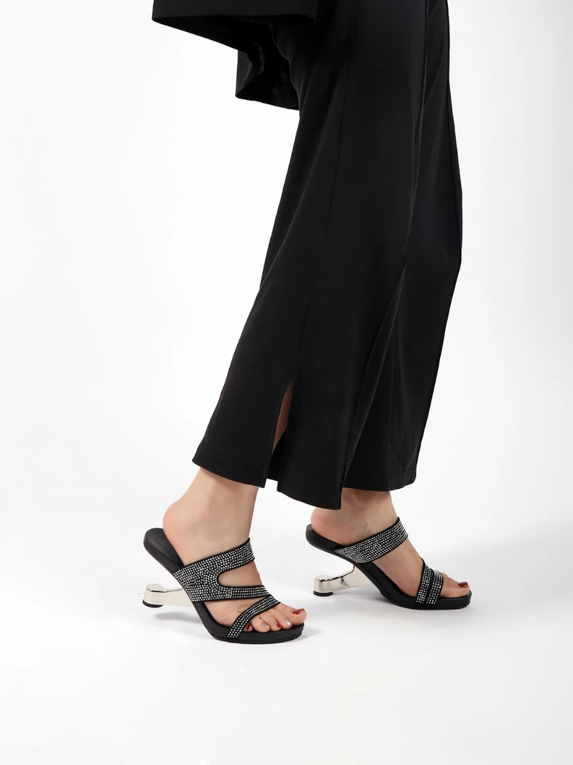 Adorn your feet with the art-inspired style of these modern elevator-heel slides features the cut-out and rhinestone design to lift your elegant looking.