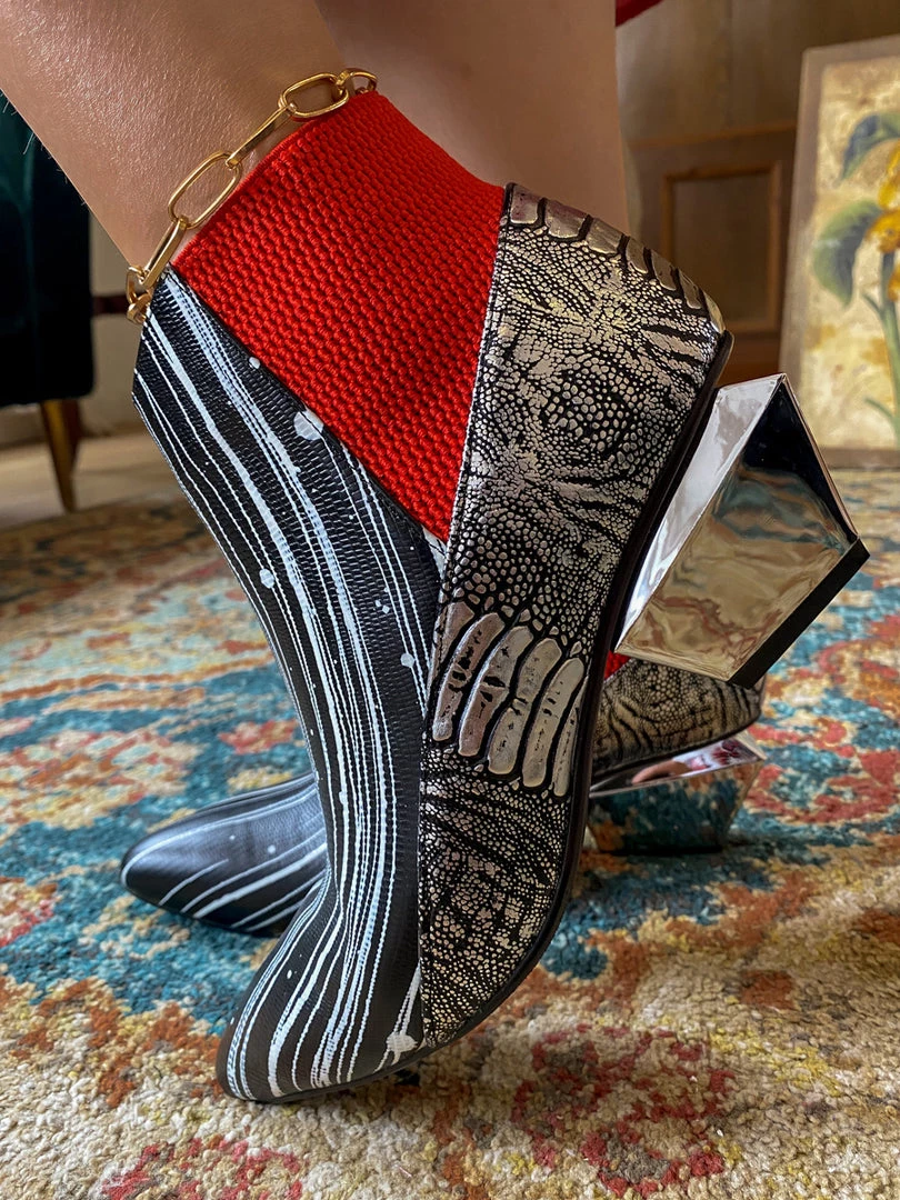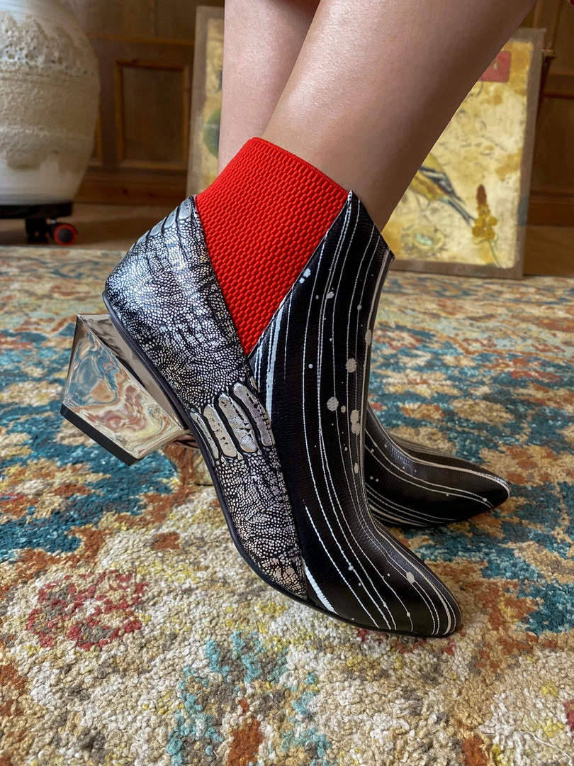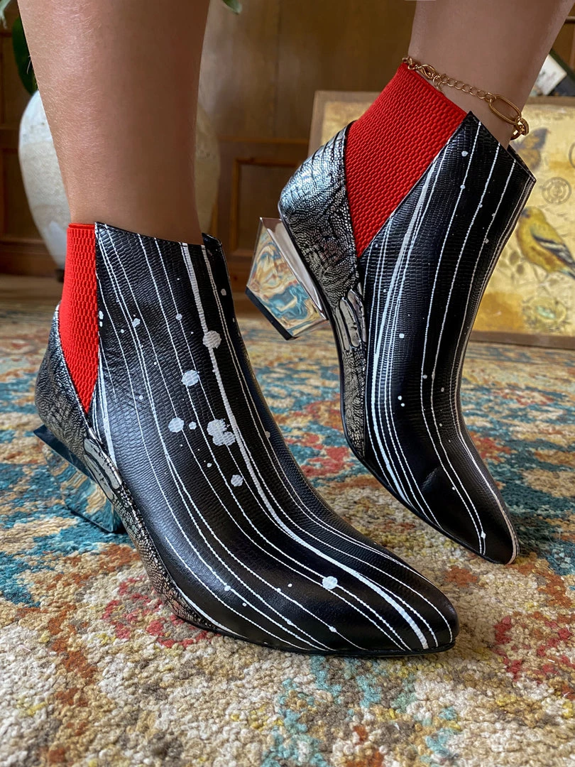 Go for a contemporary look in these marvelously modern booties, that are sure to turn heads thanks to the structural block heel and allover eye-catching pattern.