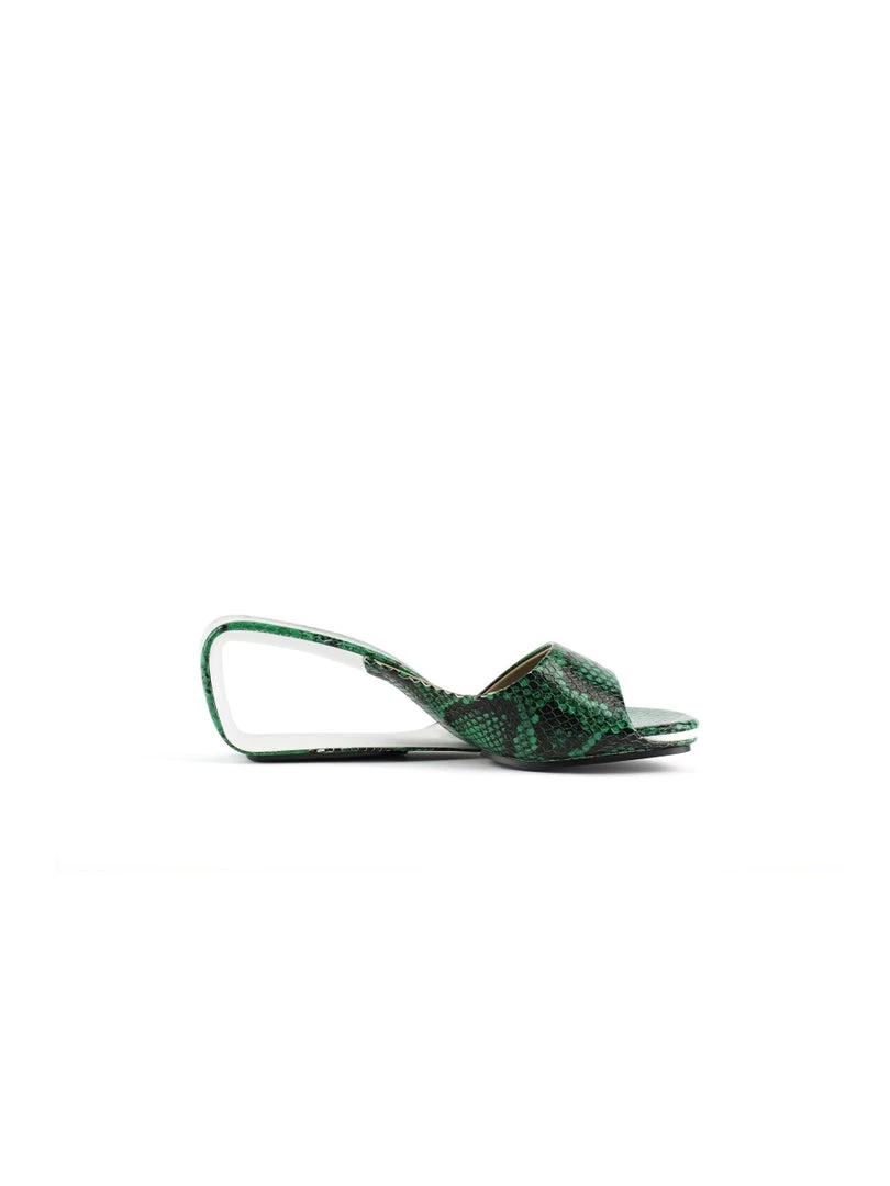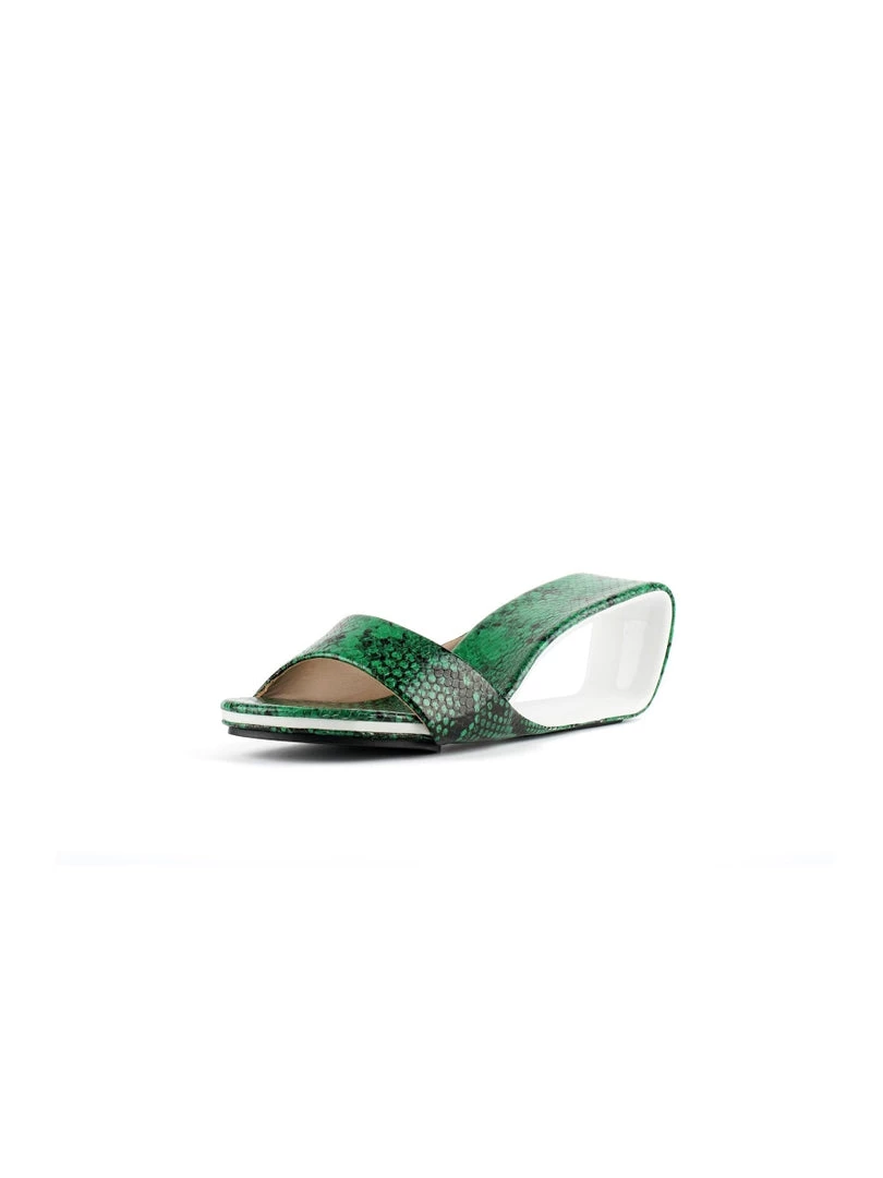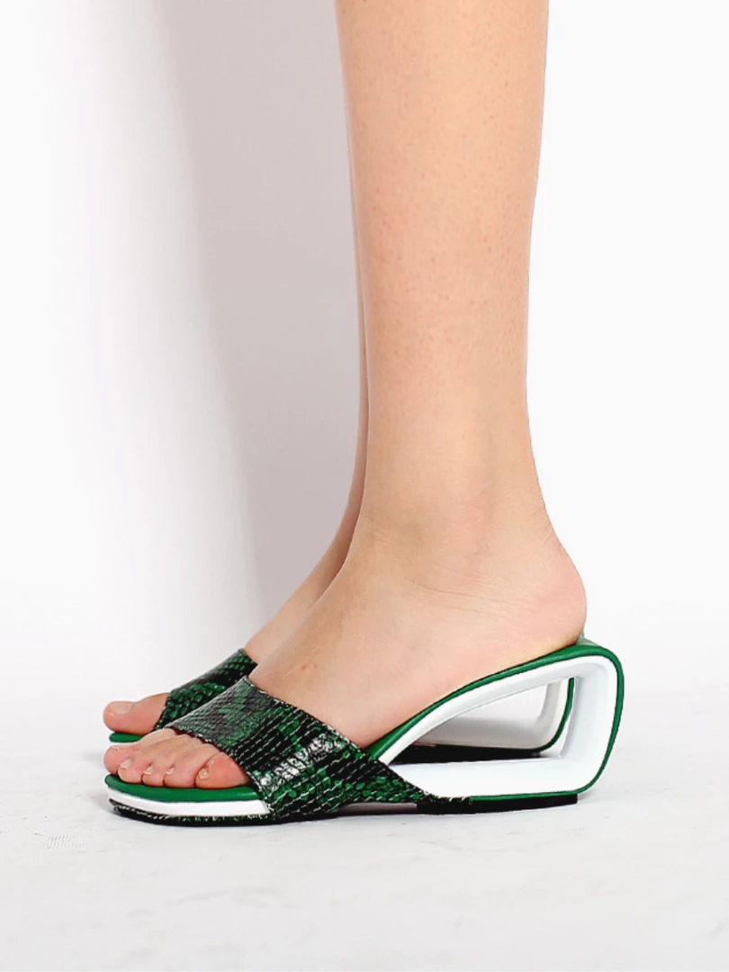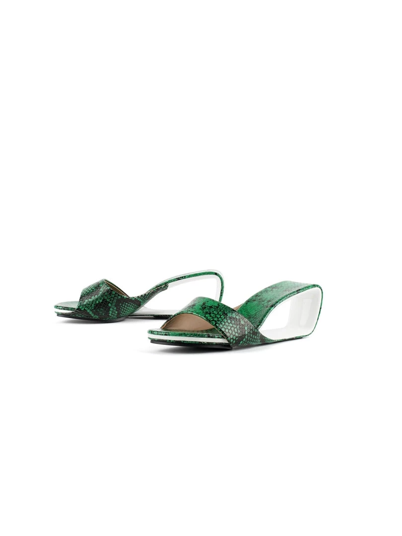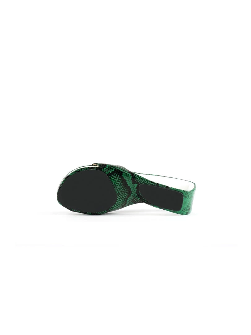 Adorn your feet with the lux art-inspired style of these modern open twisted-heel sandals with green snake pattern.