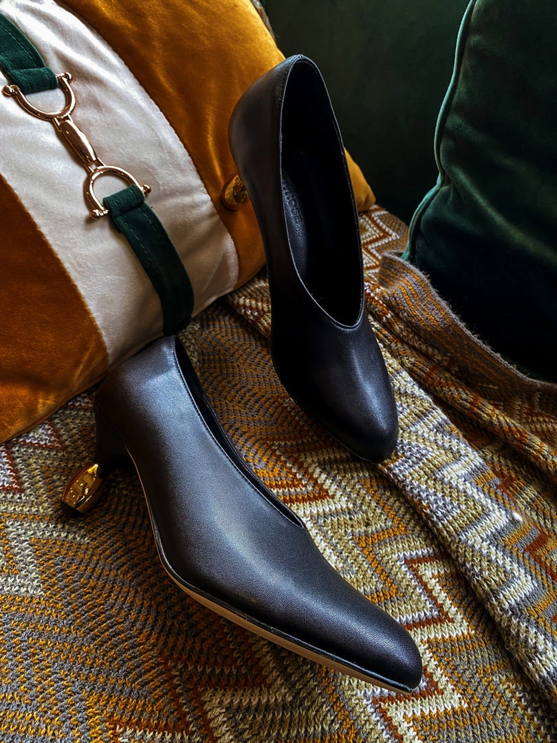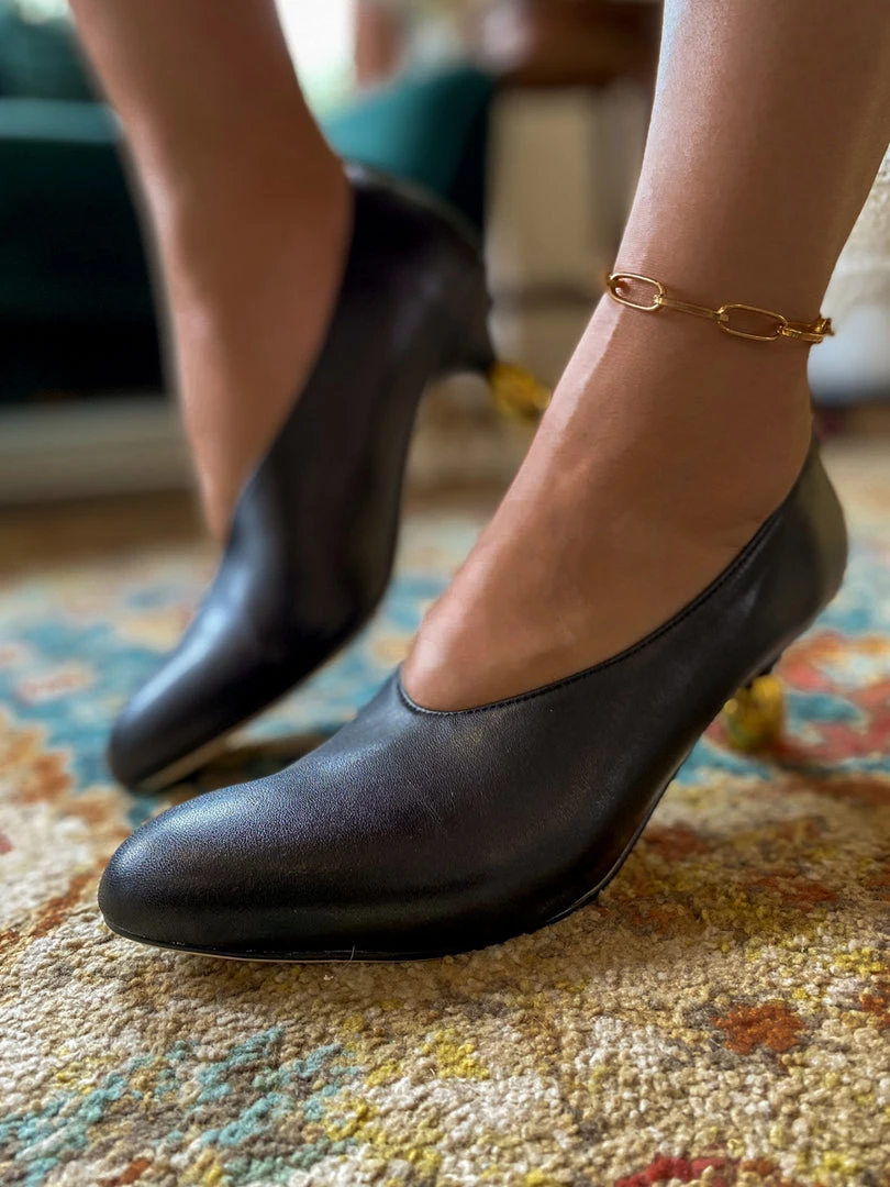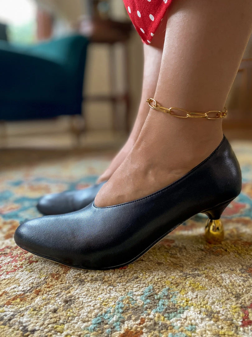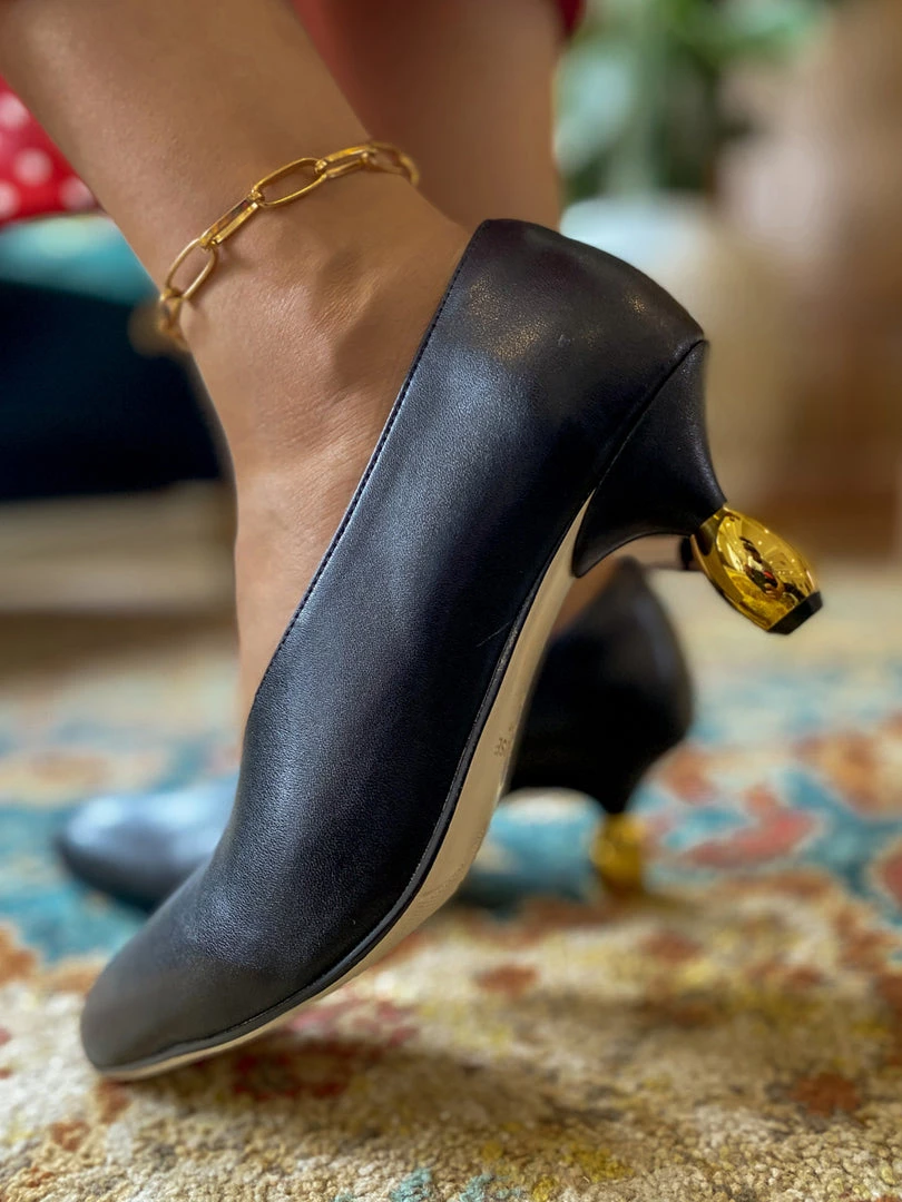 Bring bold style to your ensemble with you slip on this pump with its vibrant hue and moderate gold droplets heel.
