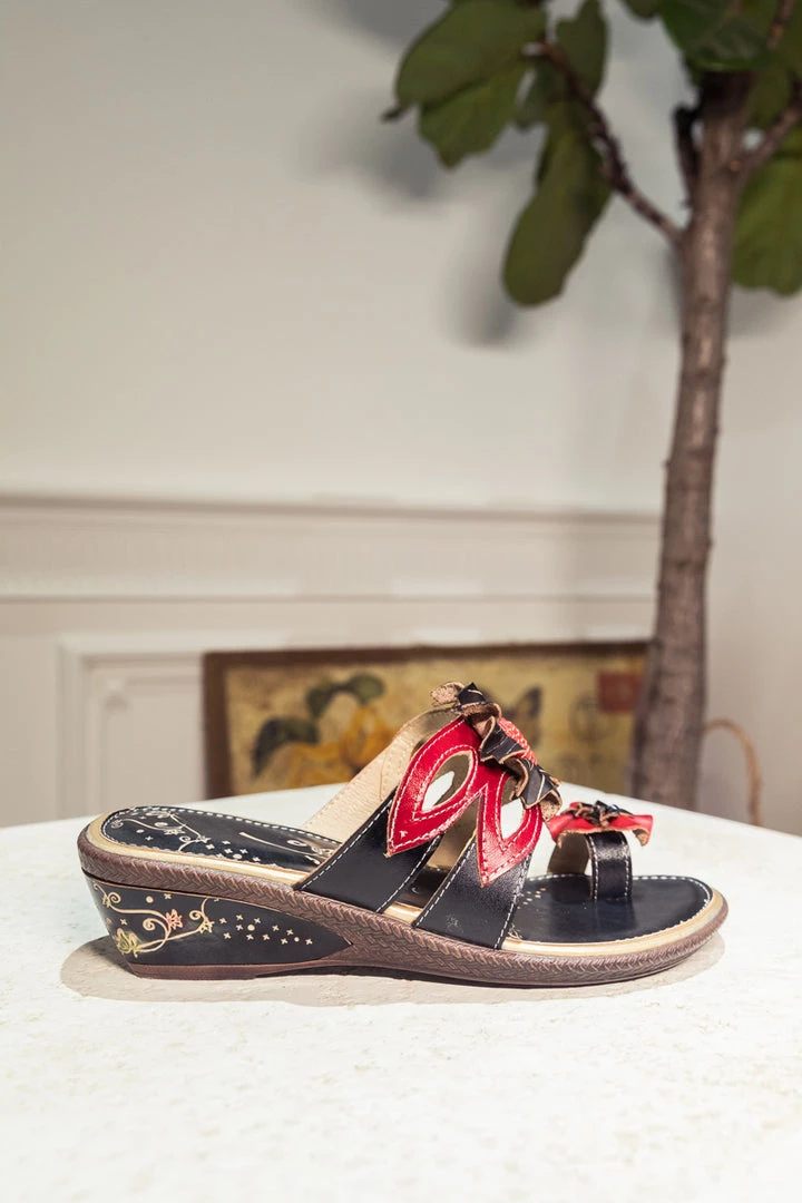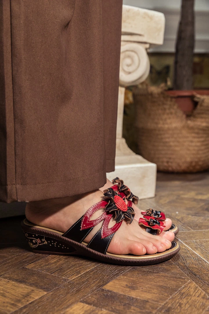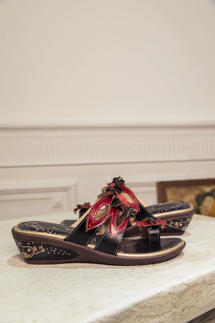 Give your casual and chic strides a stylish look with this leather floral applique sandal showing off a vintage unique design.