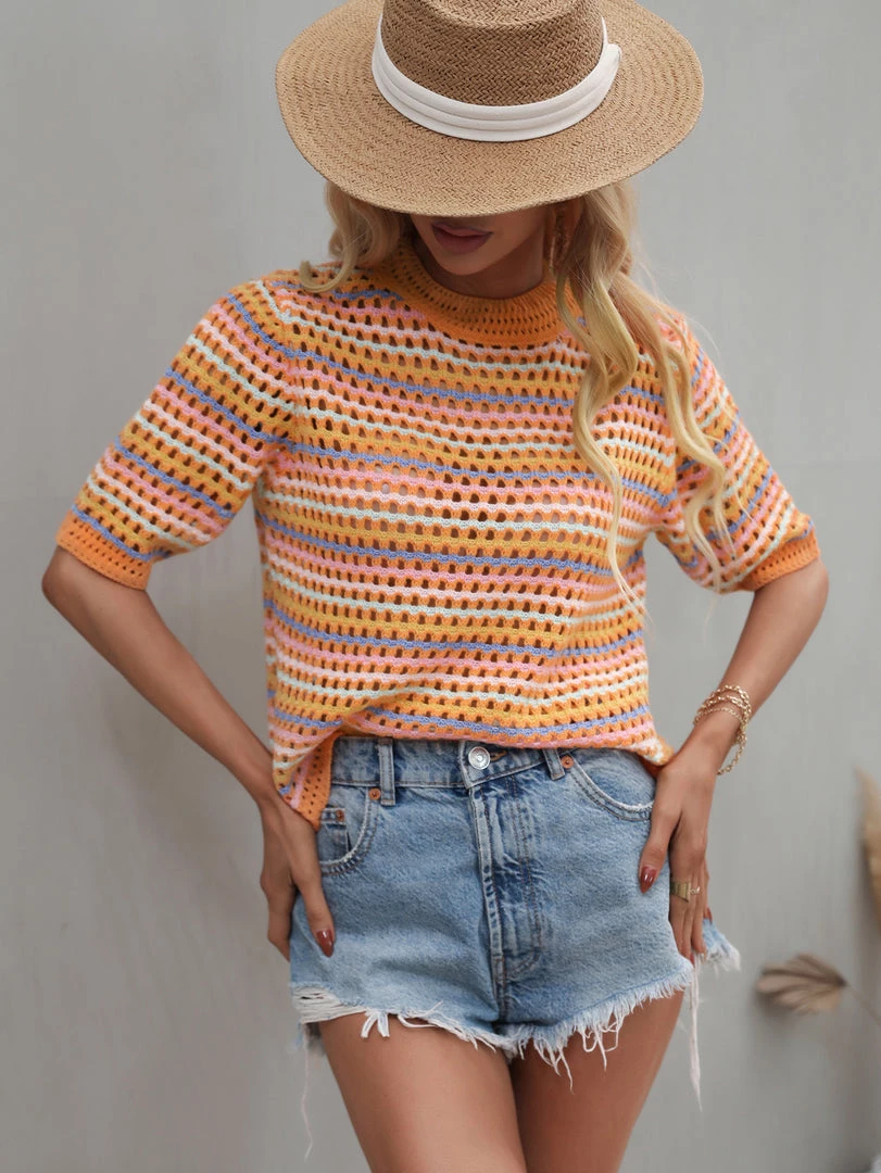 Our Bee Knit Top comes in tones of orange, pink, blue, and white striped pattern. You can never have too much knitwear, especially when we are transitioning through to early summer. This comes in a classic stripes design and fitted style that is perfect for layering! Pair this top with our latest thong styles to complete the look!
