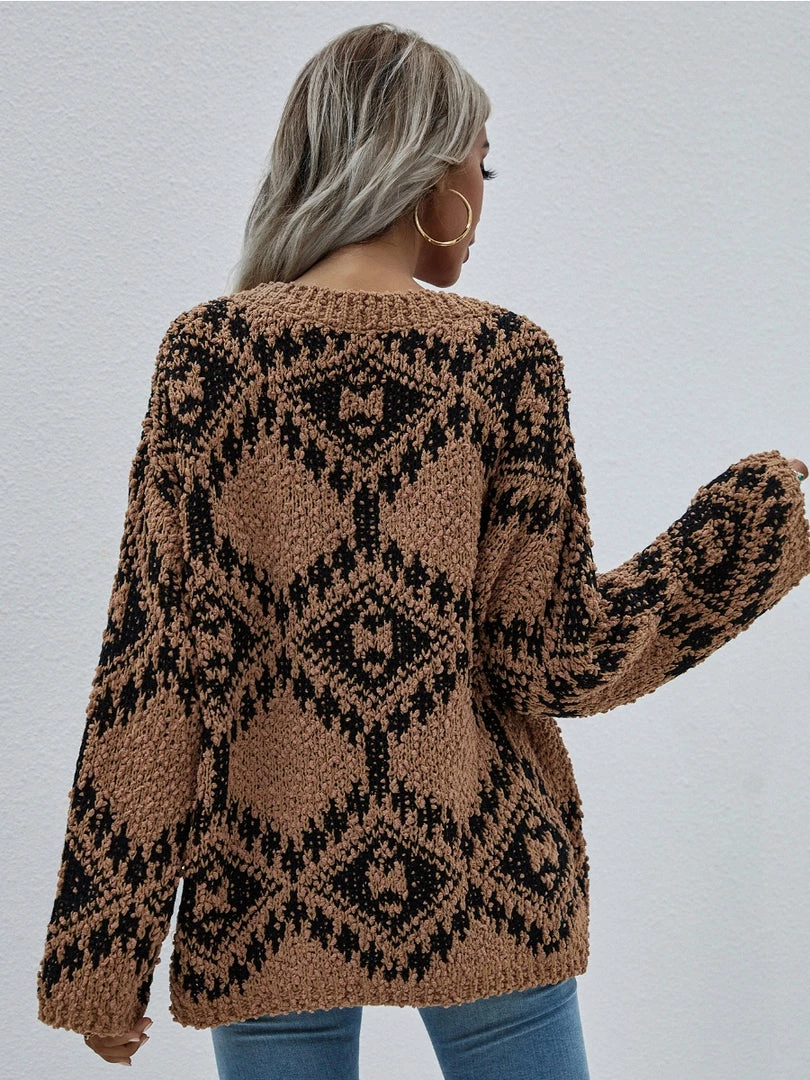 Embrace your free-spirited approach to fashion with this long-sleeve V-neck sweater featuring an on-trend geometric pattern and lantern sleeve design.