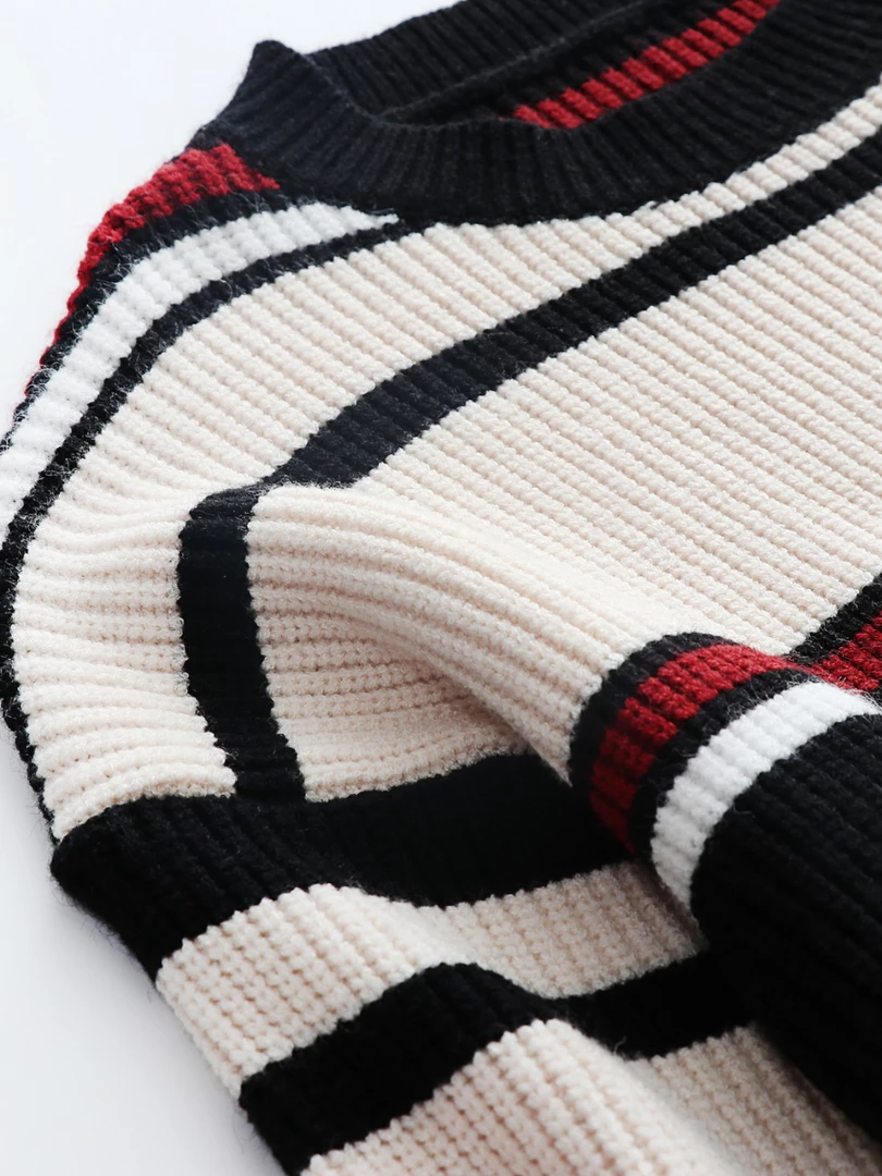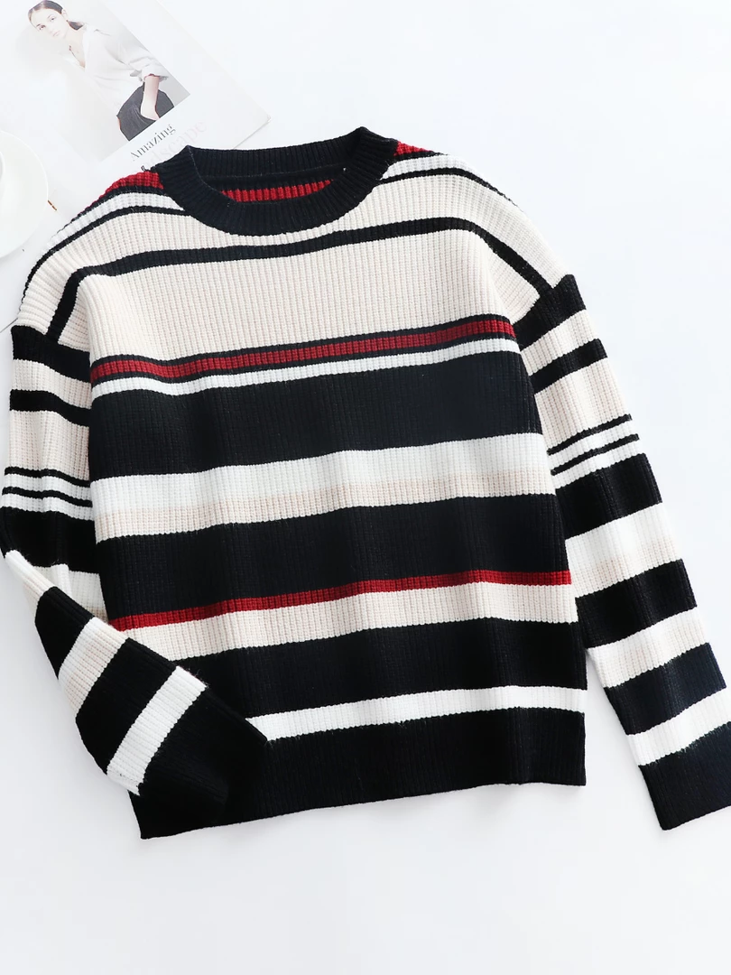 Bring sophisticated charm to your spring-weather looks when you wear this lightweight top made with a tri-colored striped print knit and crew neck.