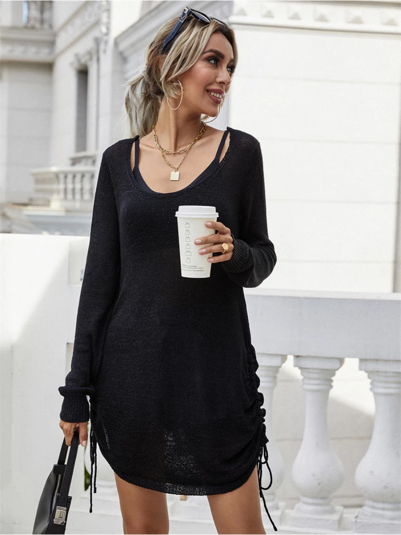 Our Castaway Knit Dress comes in a solid black tone. It features a oversized neckline and a low open back hemline. This dress designed with two side string to make the best flexible fit for you!! Pair it with an elegant high heel from our range and sharp heeled boot as a stylish Spring look.