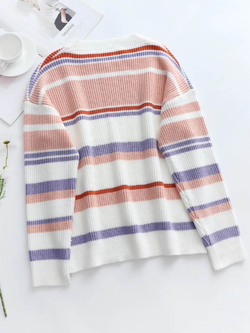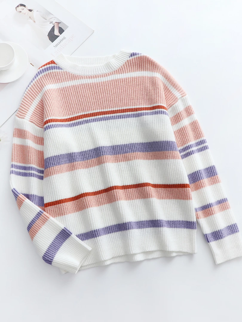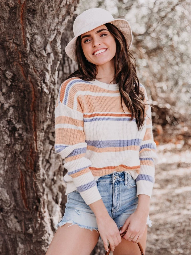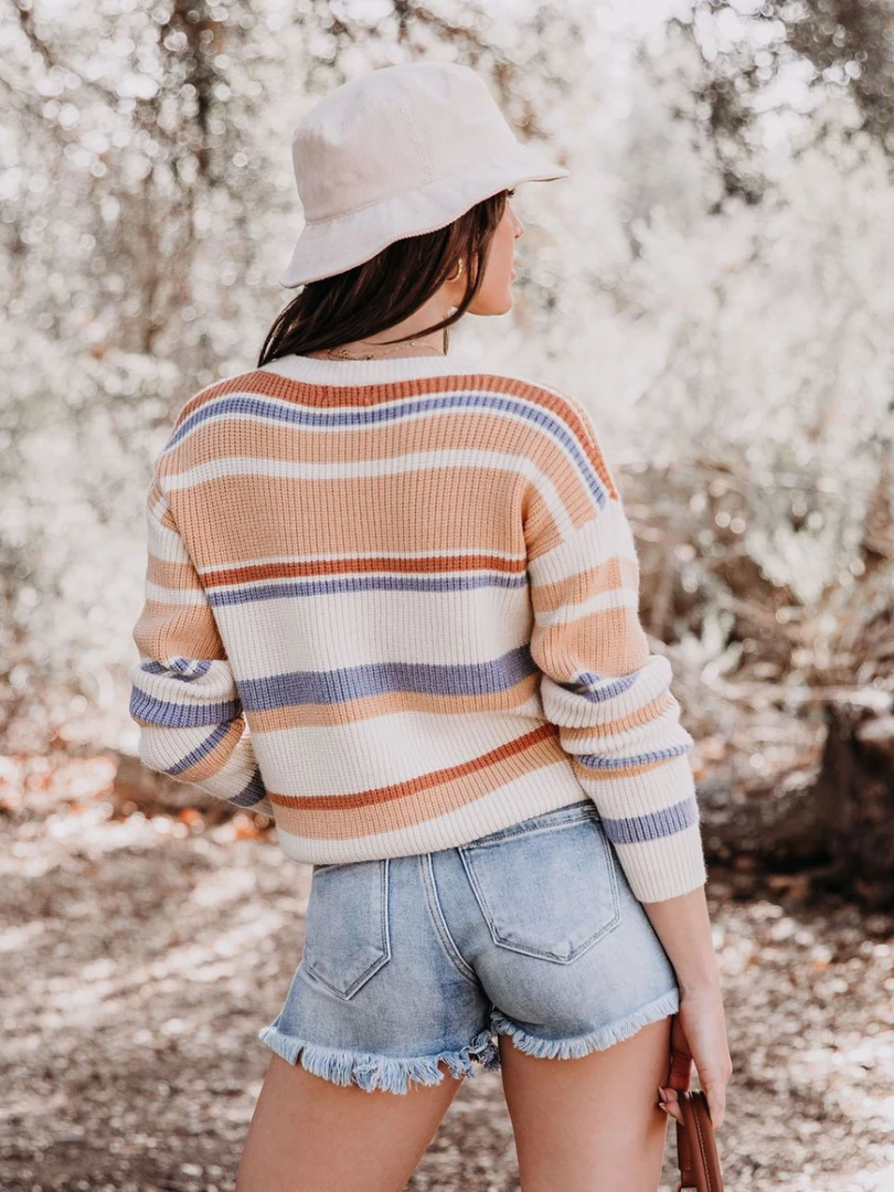 Bring sophisticated charm to your spring-weather looks when you wear this lightweight top made with a tri-colored striped print knit and crew neck.