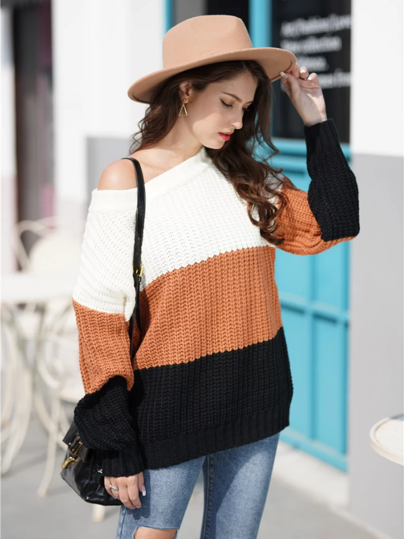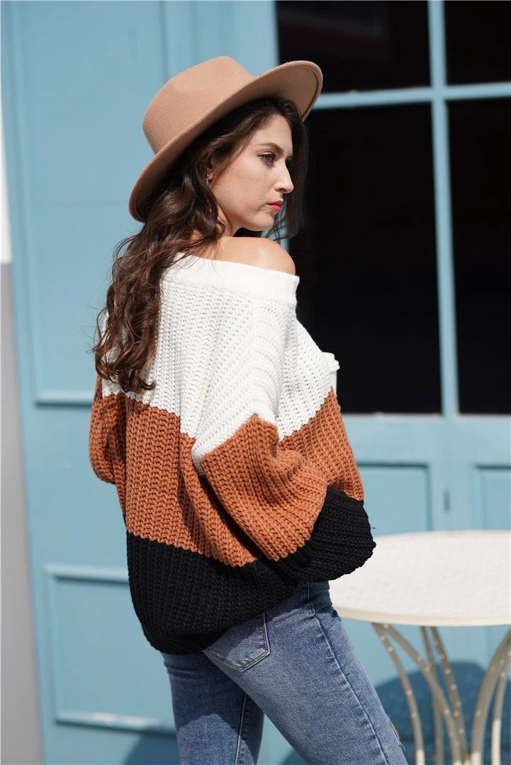 Our Evelina Knit is a brown, beige and grey stripe top. The oversized neckline can be worn as one-shoulder or off-shoulder two ways. Pair with your favourite pair of jeans and you’re good to go!