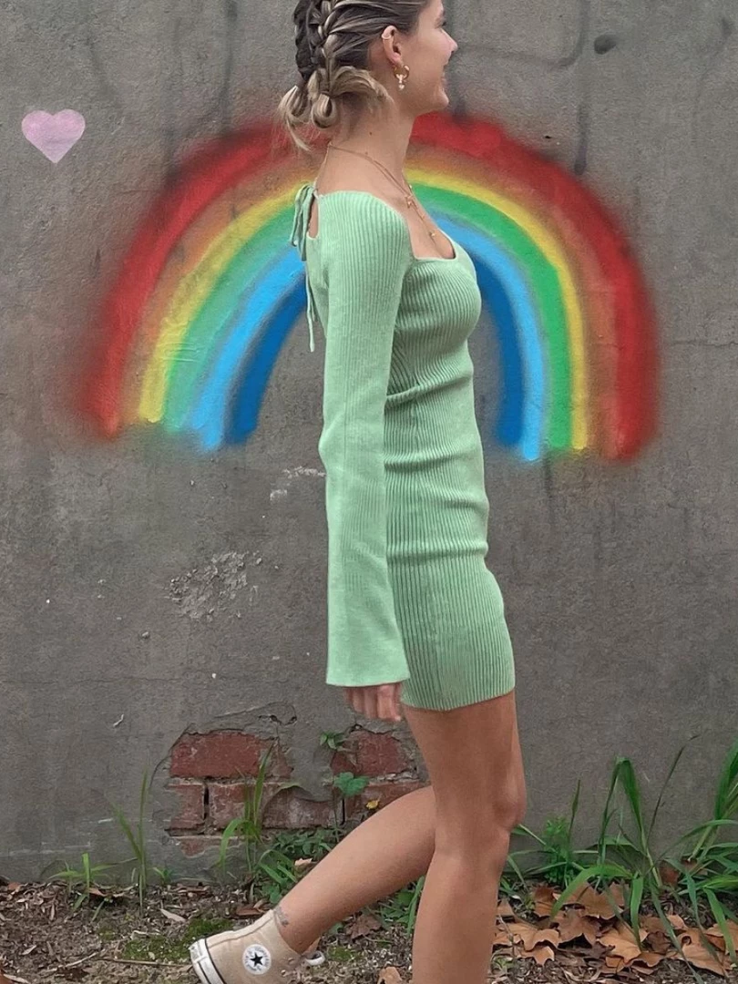 What’s cozier than a sweater? A sweater dress, of course! This knit sweater dress features long slouchy sleeves and a sweet off-shoulder design and its short skirt pairs effortlessly with our boots collection.