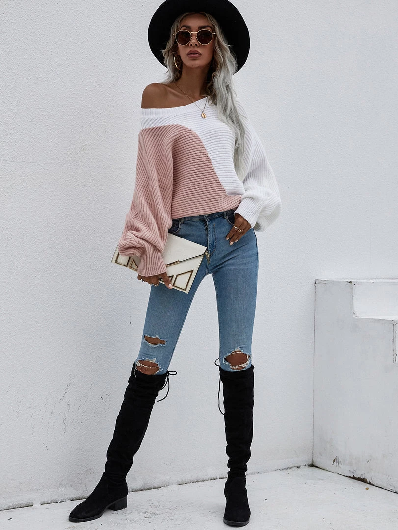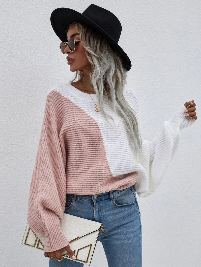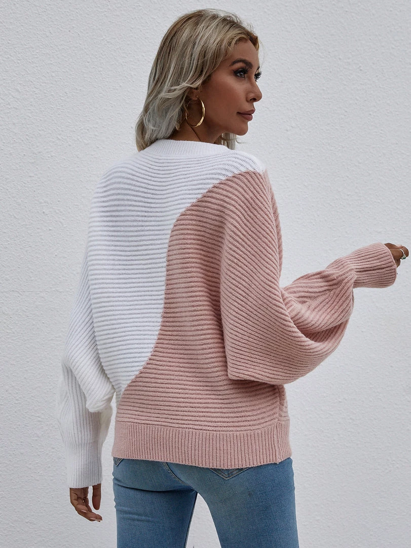 Our Grania Knit comes in a white and pink block tone. This cropped knit features a round neck and long relaxed batwing sleeves for a warm, comfortable fit. It’s an elegant layer to keep you warm and classy during the colder months ahead!