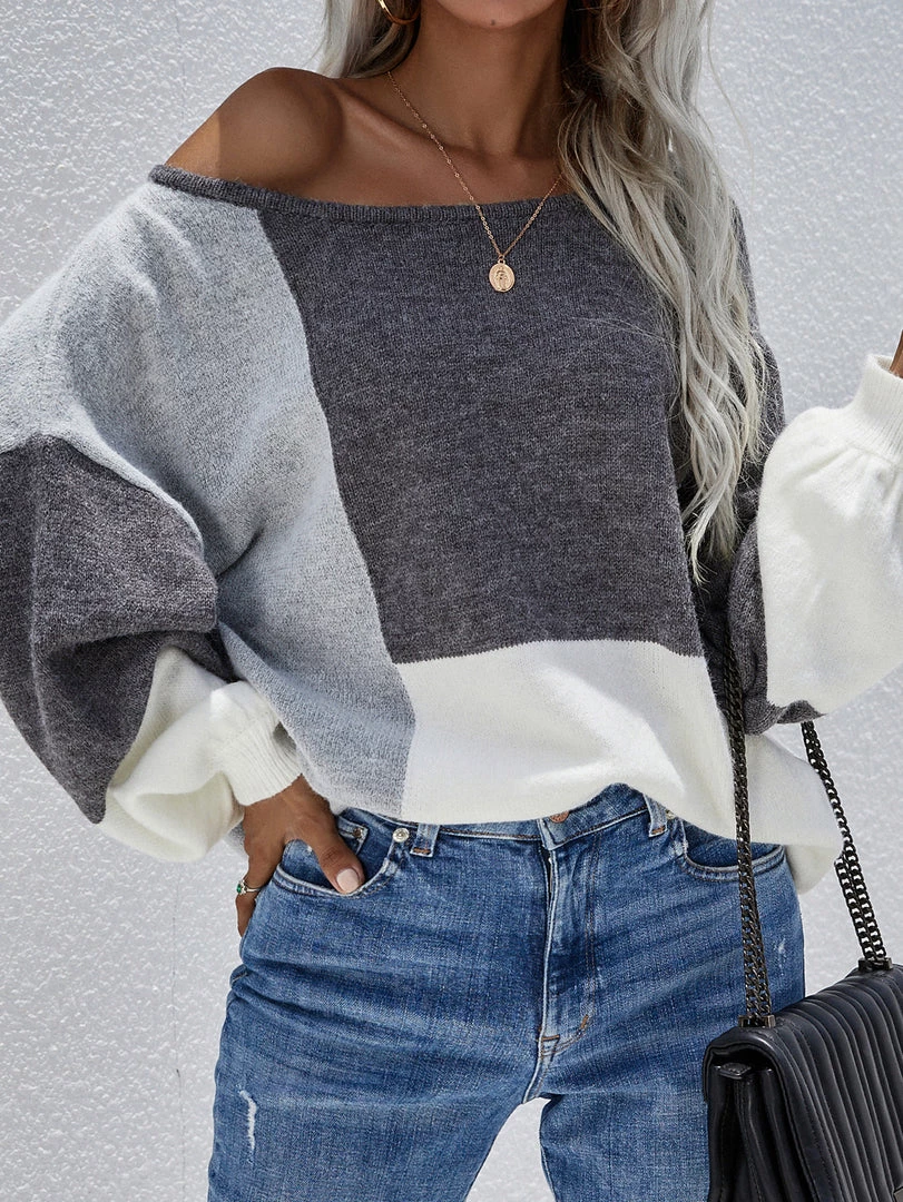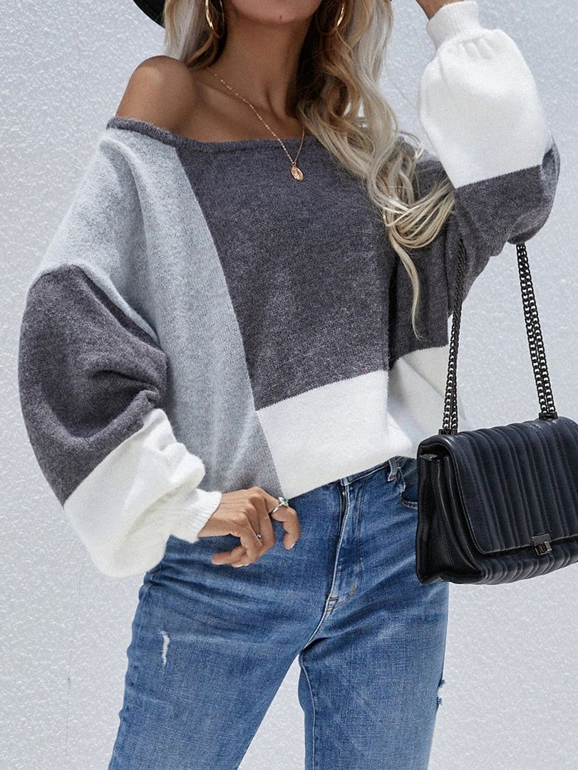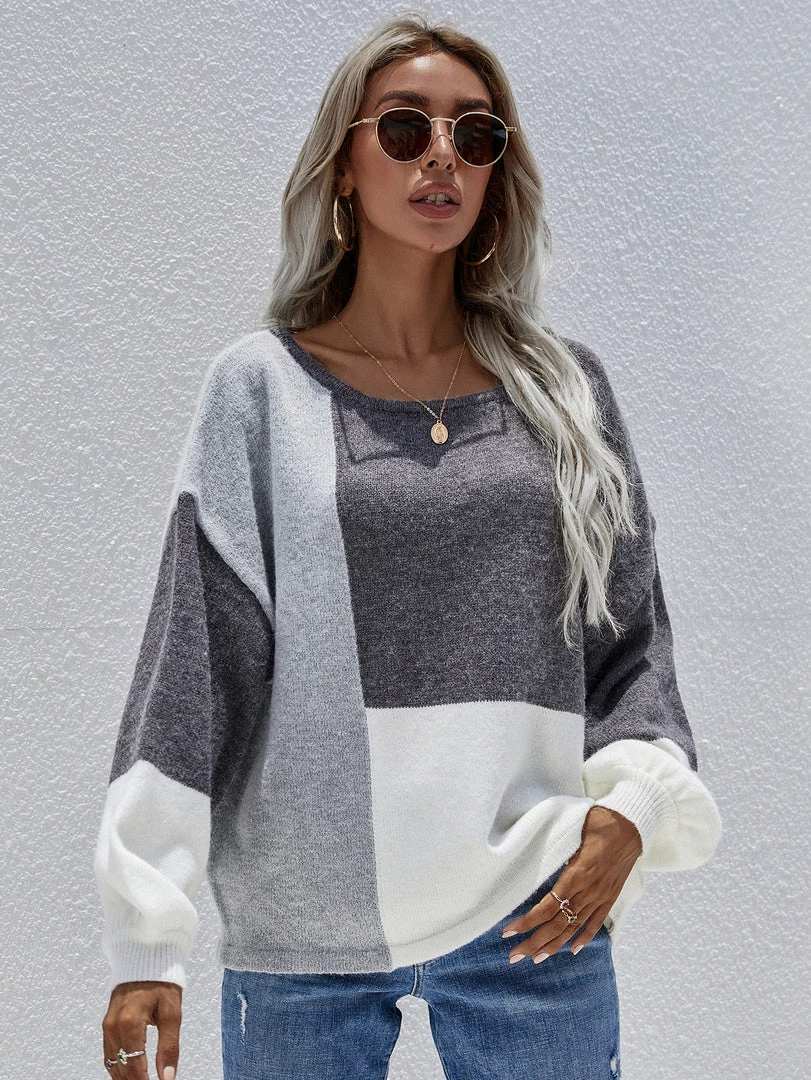 Update your knitwear collection with this soft sweater boasting a relaxed silhouette and a neutral-tone color block design.