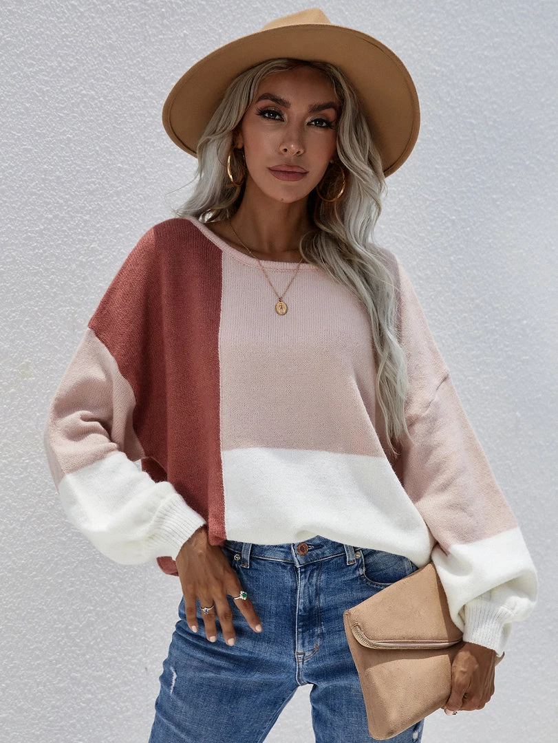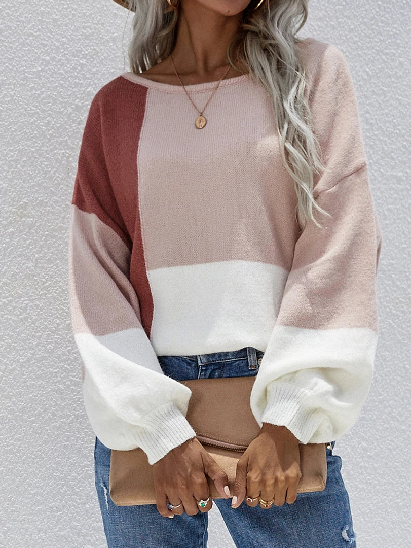 Update your knitwear collection with this soft sweater boasting a relaxed silhouette and a neutral-tone color block design.