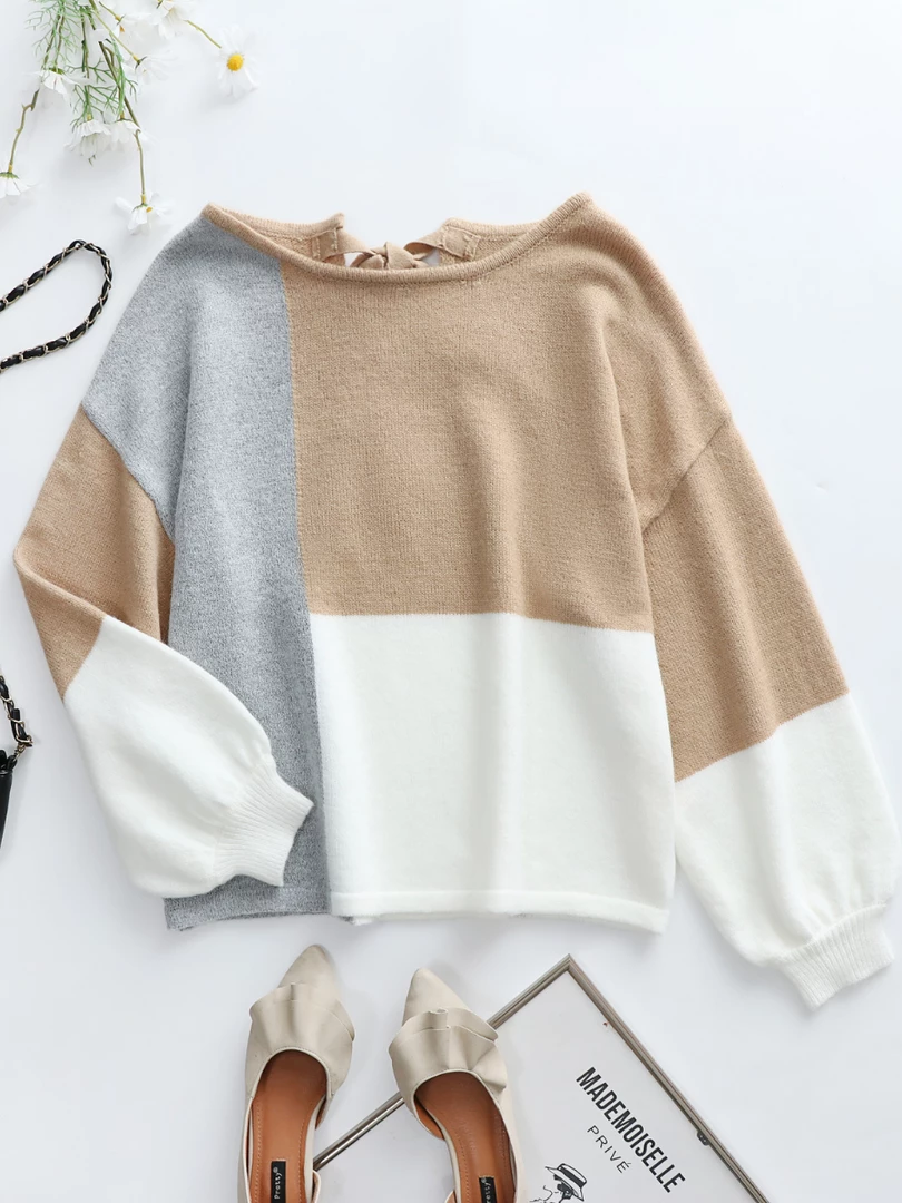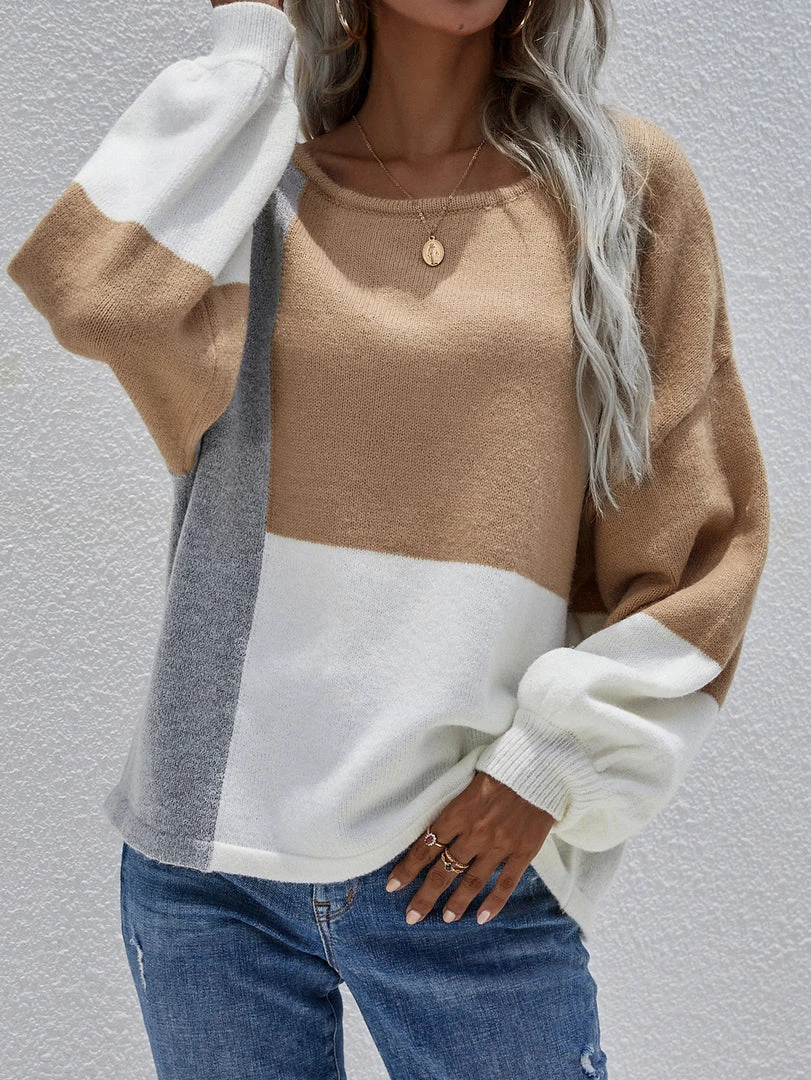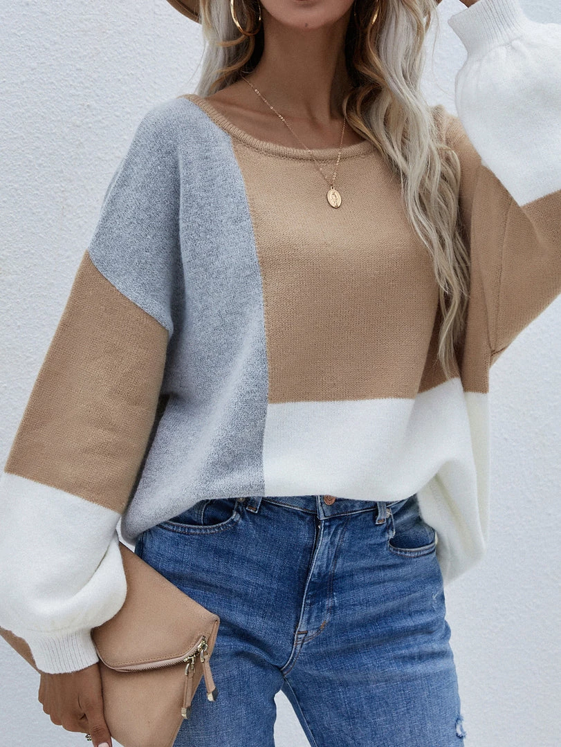 Update your knitwear collection with this soft sweater boasting a relaxed silhouette and a neutral-tone color block design.