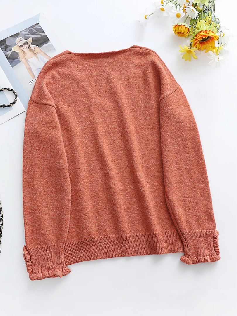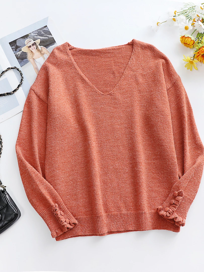 Our Darius Jumper comes in a natural orange tone. It features a low v-neckline and long sleeves with ruffle cuff details for a comfortable, luxurious fit. This knit is perfect for layering during the upcoming spring season ahead!