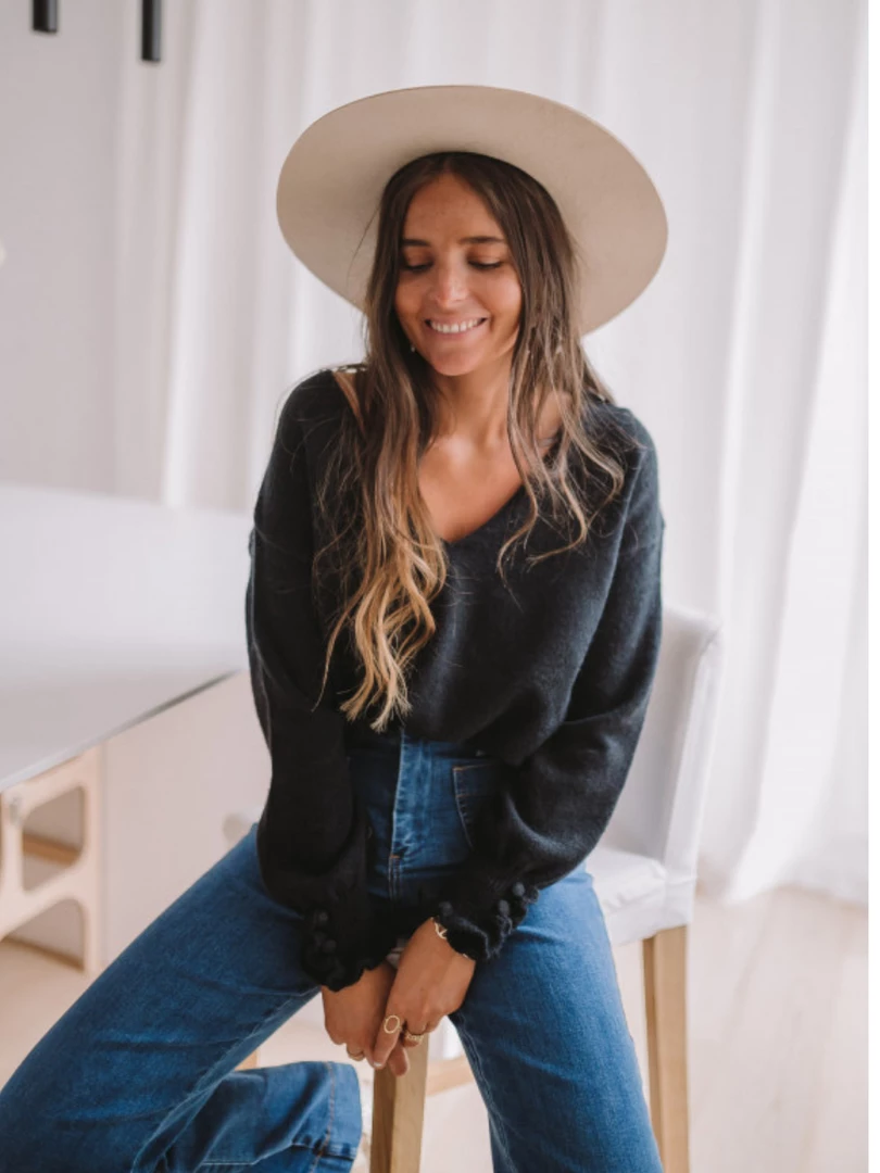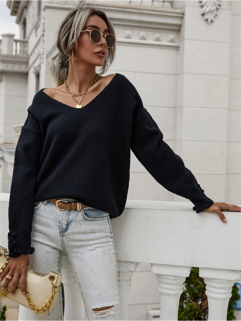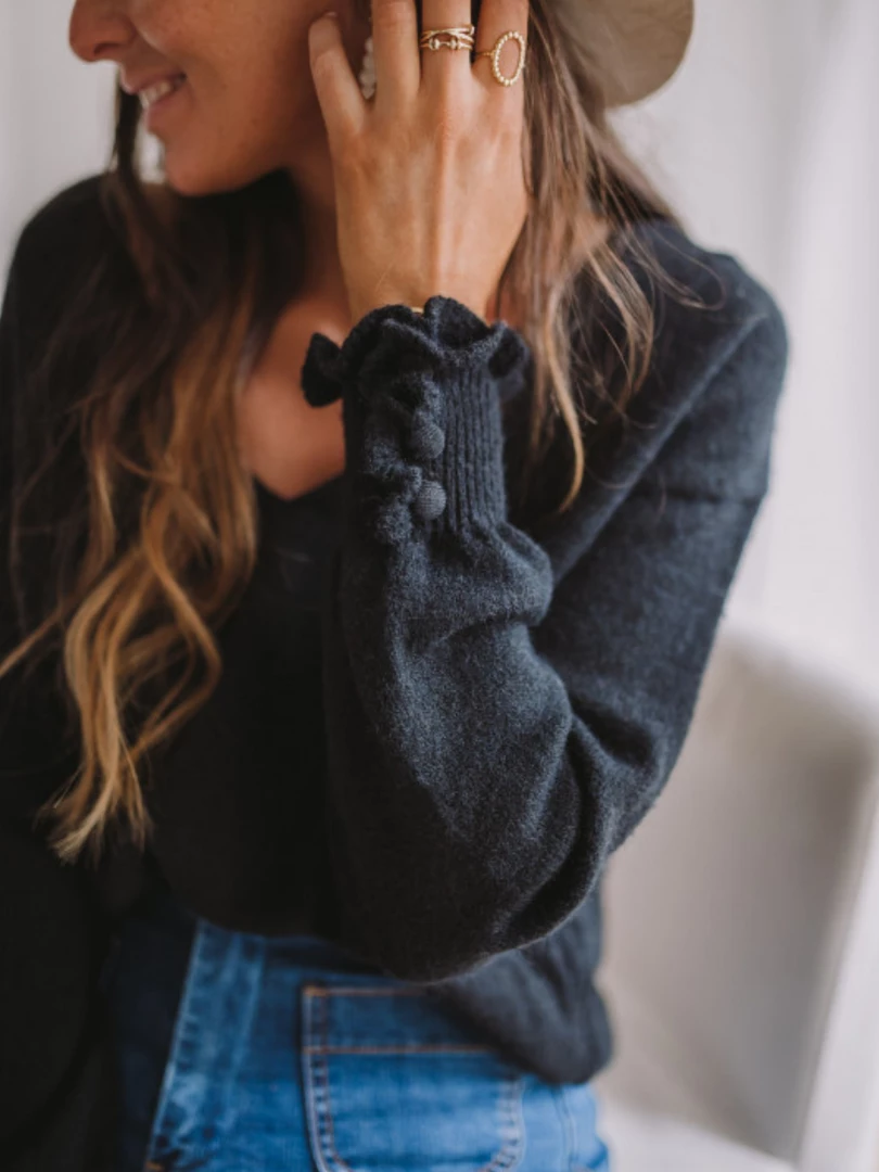 Our Darius Jumper comes in a deep black tone. It features a low v-neckline and long sleeves with ruffle cuff details for a comfortable, luxurious fit. This knit is perfect for layering during the upcoming spring season ahead!