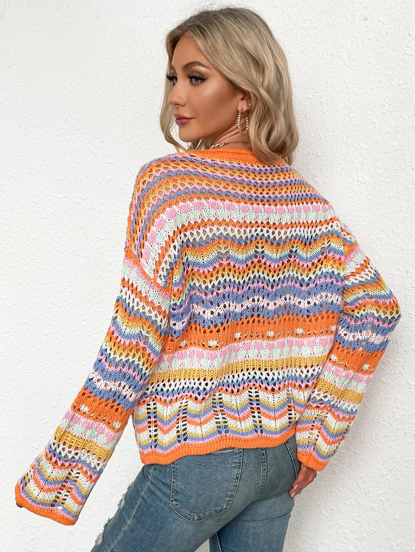 Our Carmo Top comes in a orange tone base, with a multicoloured stripe pattern. It features a high neckline and a long straight sleeves for a relaxed, comfortable fit. This cute knit is perfect for layering during the spring months ahead!.