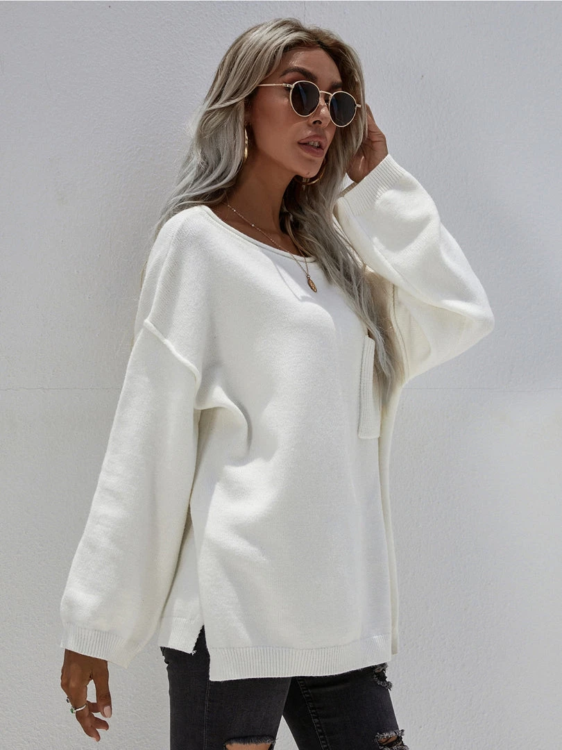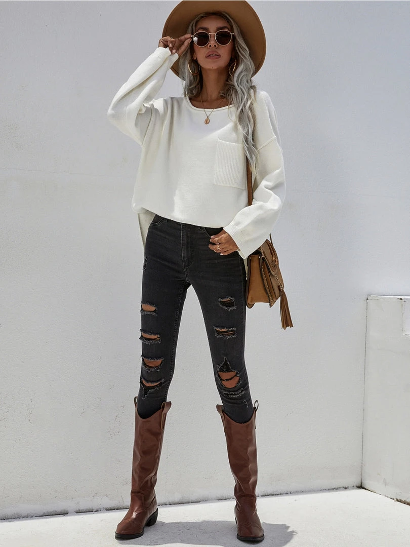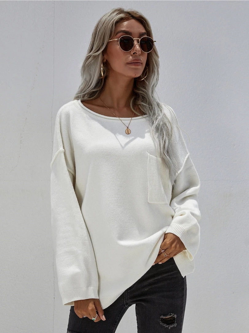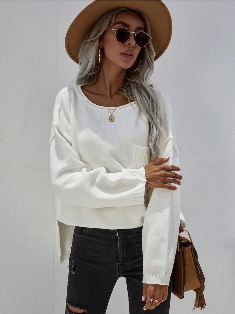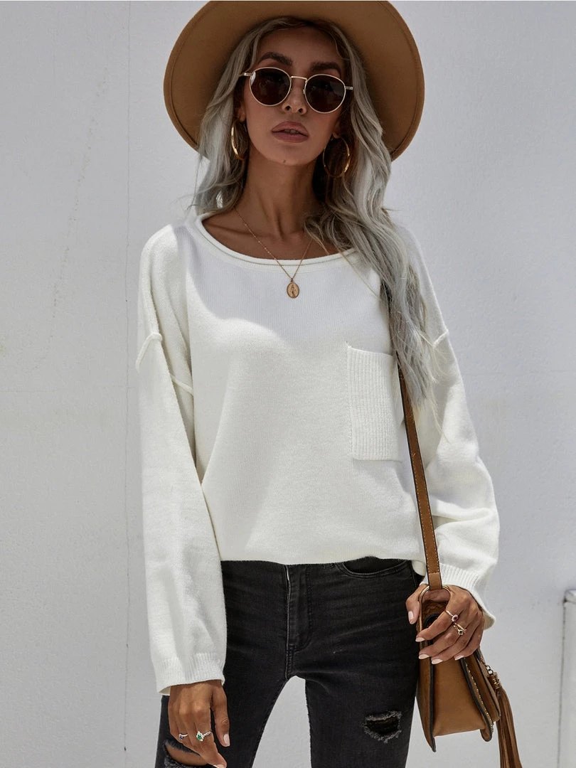Our Doretta Knit comes in soft tone base. It features a rip neckline, long relaxed sleeves, and a large pocket in front of the garment. This cute knit is perfect for layering during the cold winter months!