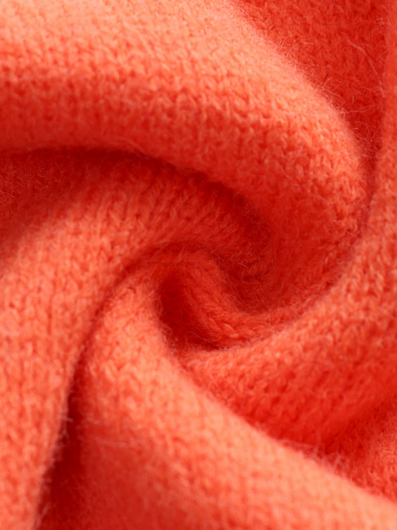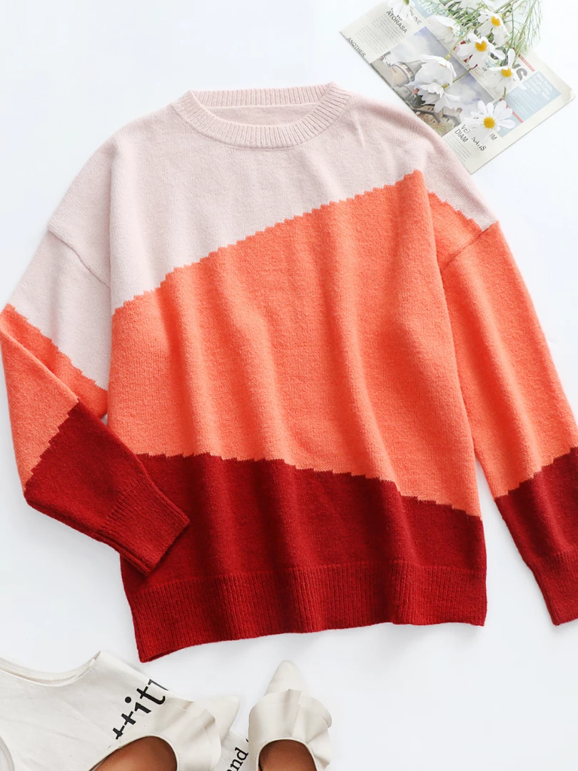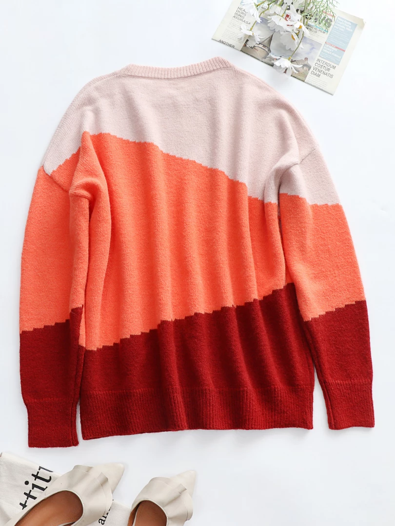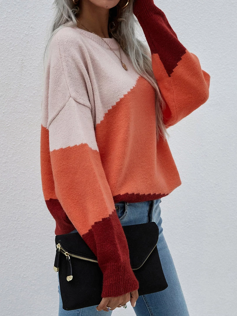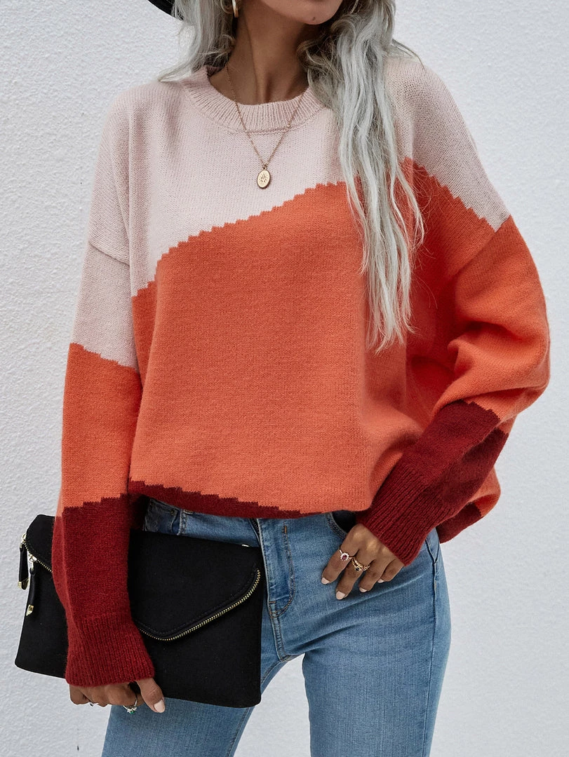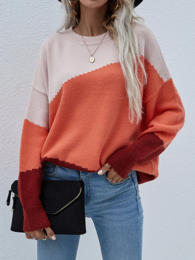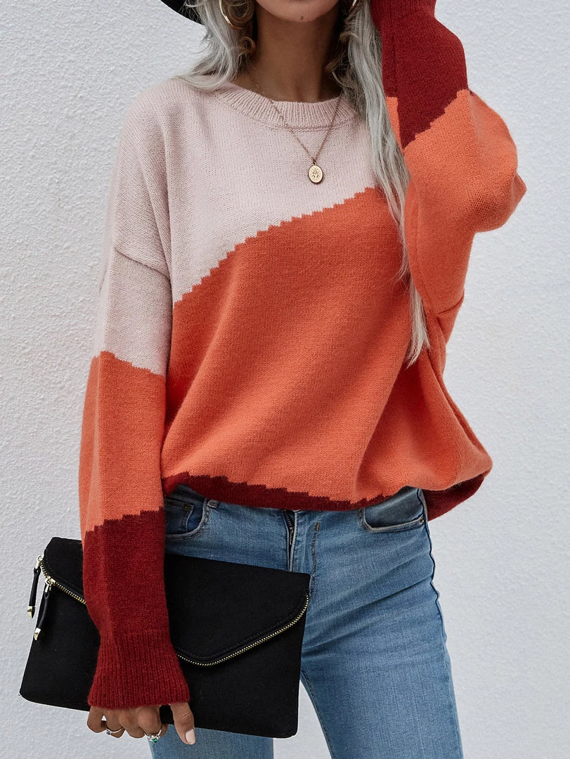 Our Elma knit jumper comes in a orange, beige & claret block print. It features a crew neckline and long relaxed sleeves for a comfortable, luxurious fit. This cute jumper is ideal for layering during the colder months.