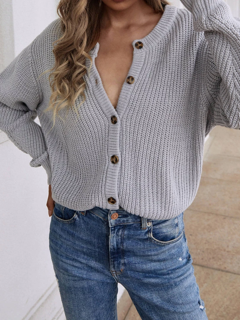 Boost your cool-weather rotation with this roomy round neck cardigan crafted with a button-front closure and supersoft, cable-knit fabric.