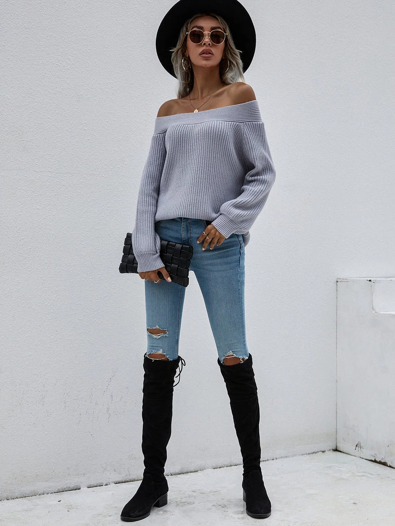 Liven up your knitwear collection with this off-shoulder sweater, designed to charm with a neutral-tone solid color and retro-cool bell sleeves.