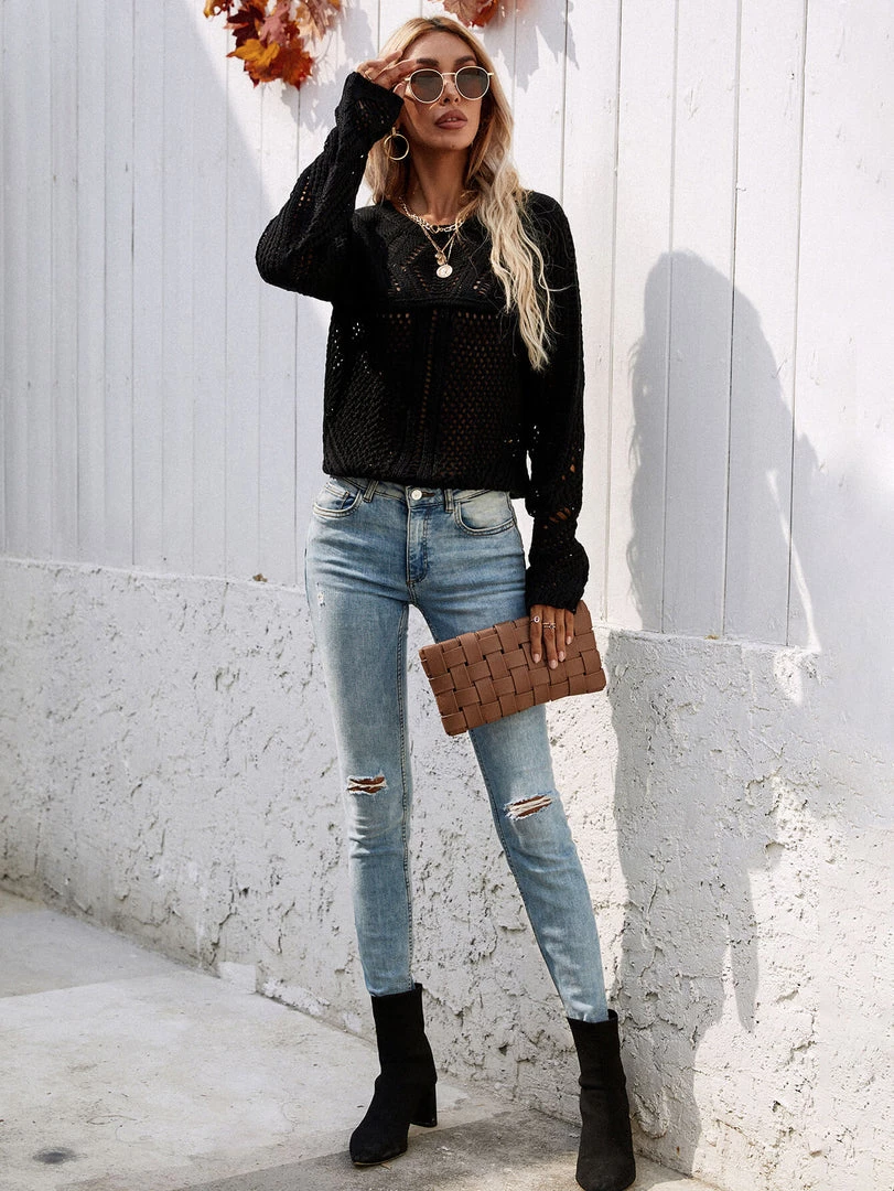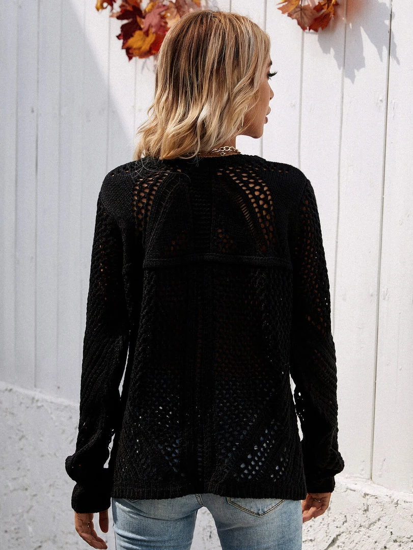 Refresh your wardrobe for the upcoming season with this sweater boasting a crochet design and soft, stylish shades.