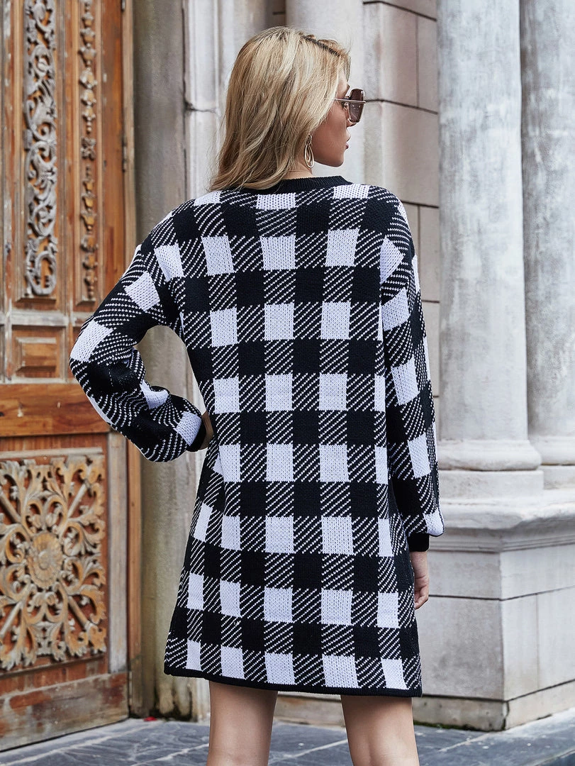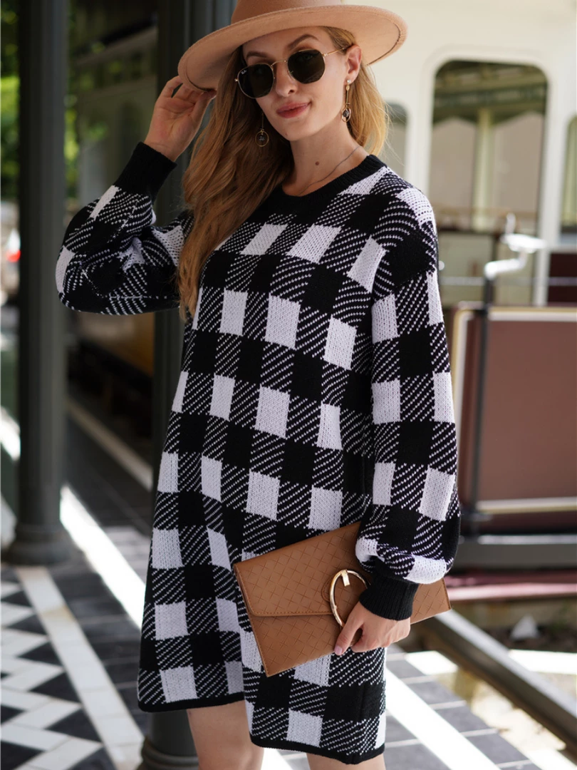 Our Kaitlyn Knit Dress comes in a black and white check print. It features long sleeves and round neck for a relaxed, comfortable fit that makes it perfect for layering during the cold winter months!!