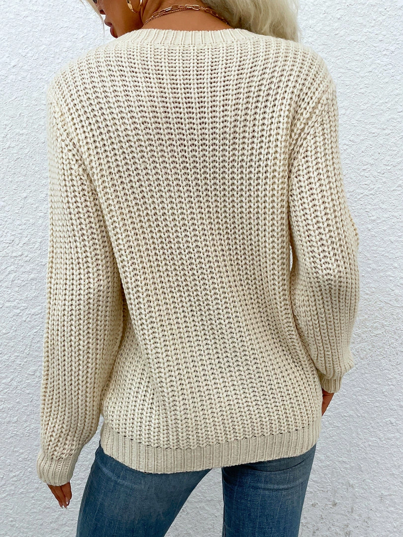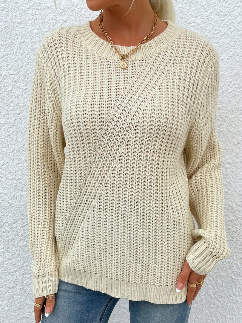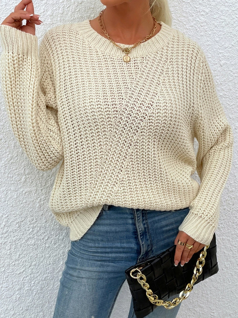 Our Lecia Knit comes in a solid soft beige tone. It features a round neckline, long relaxed sleeves and a woven knit pattern all over the garment. This fun knit is the perfect casual layering piece for the colder and spring days ahead!