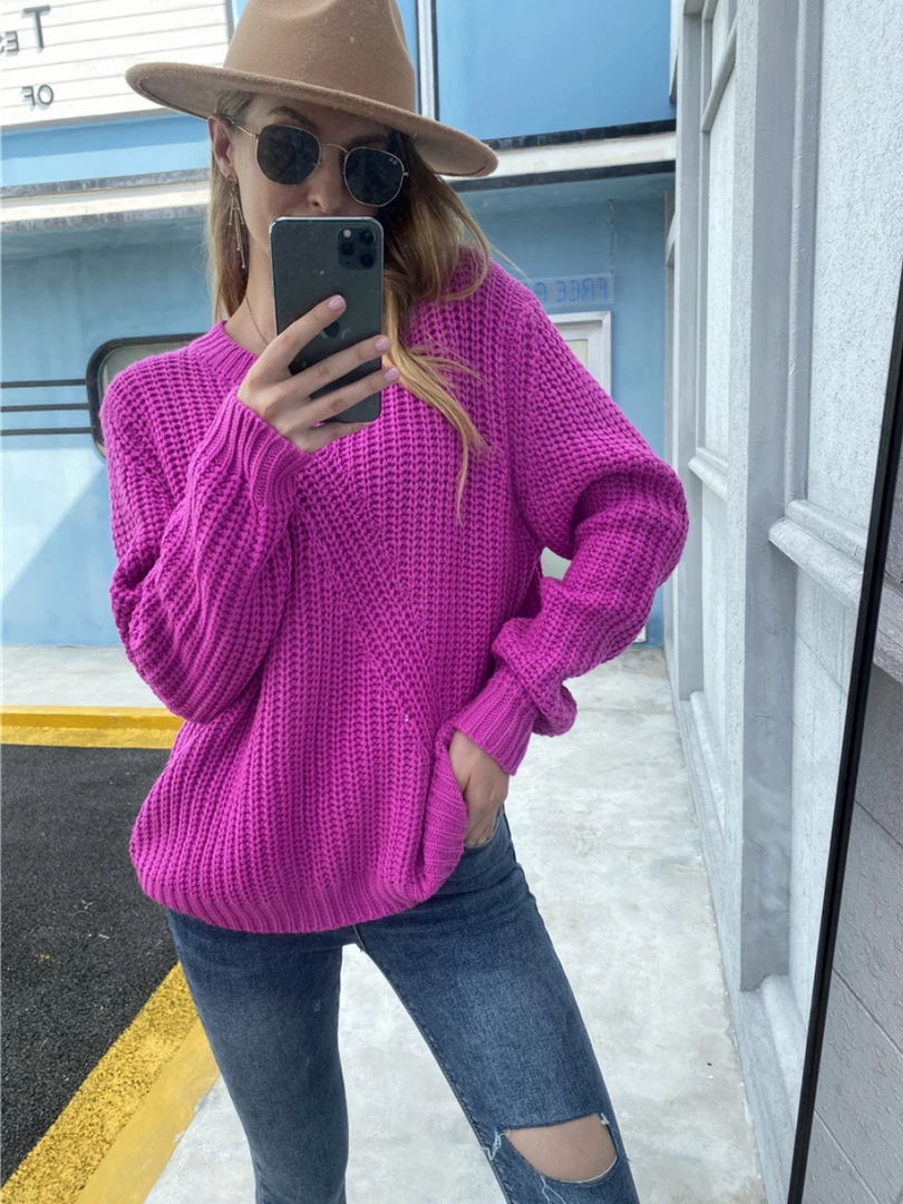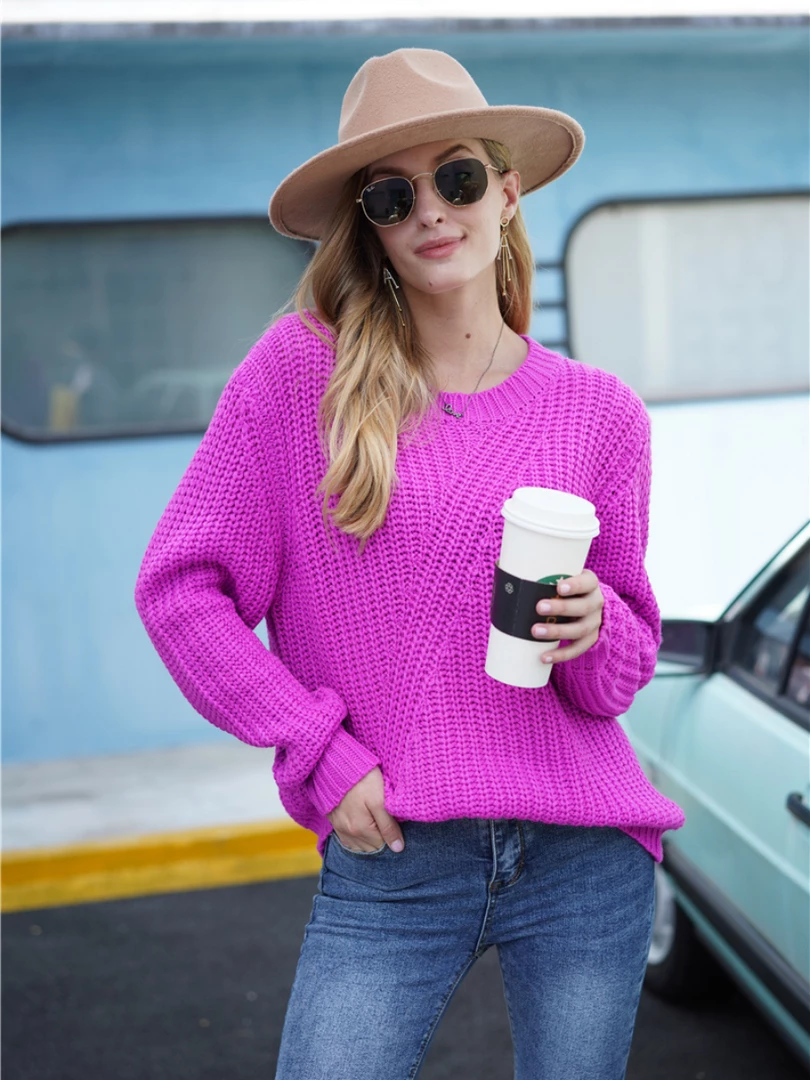 Our Lecia Knit comes in a neon pink tone. It features a round neckline, long relaxed sleeves and a woven knit pattern all over the garment. This fun knit is the perfect casual layering piece for the colder and spring days ahead!