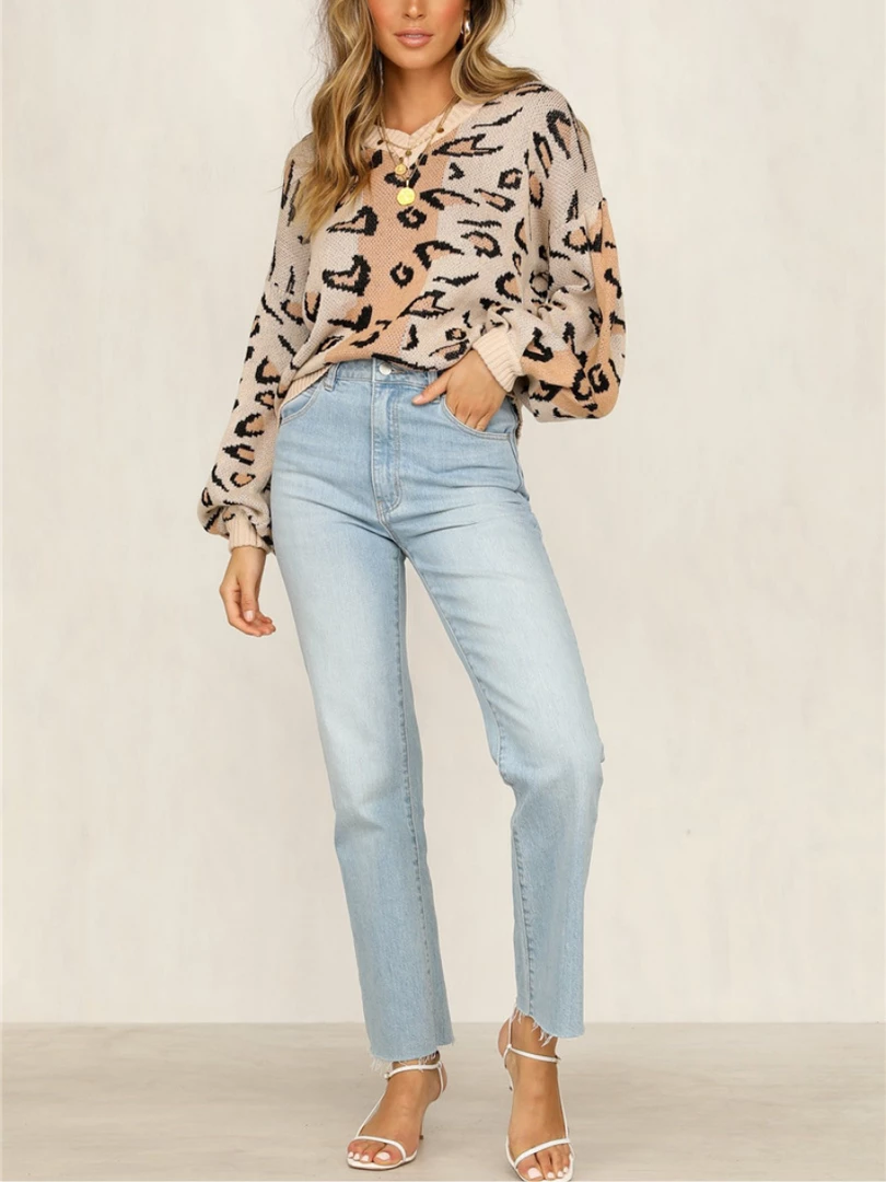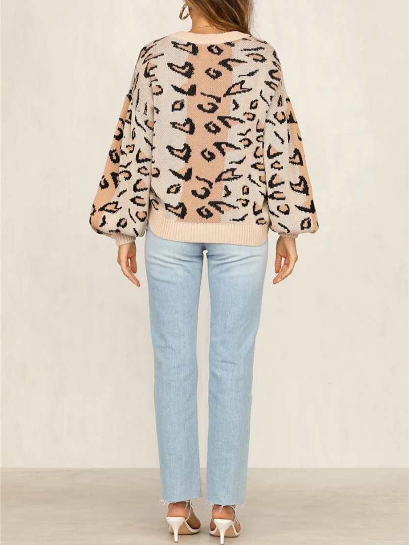 Our Nella Jumper comes in a camel tone base, with a black spot print. It features a V neckline and long lantern sleeves for a relaxed, comfortable fit. This jumper is perfect for layering during the cold winter months!