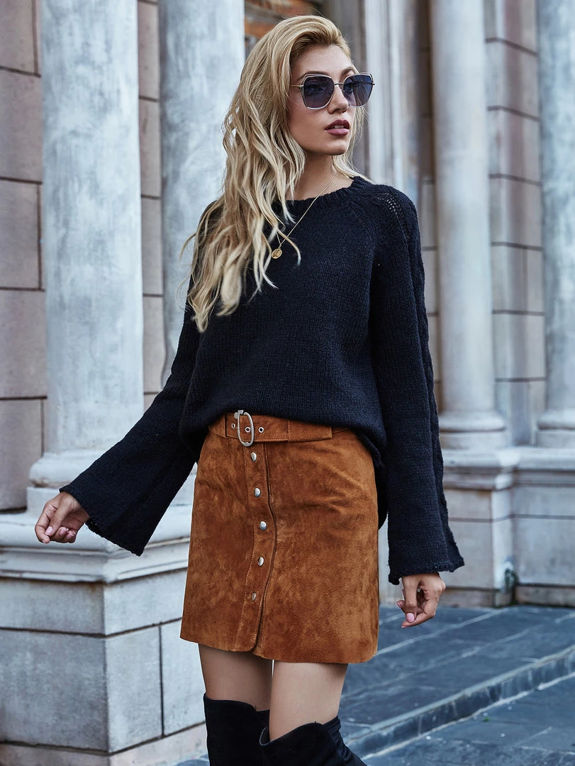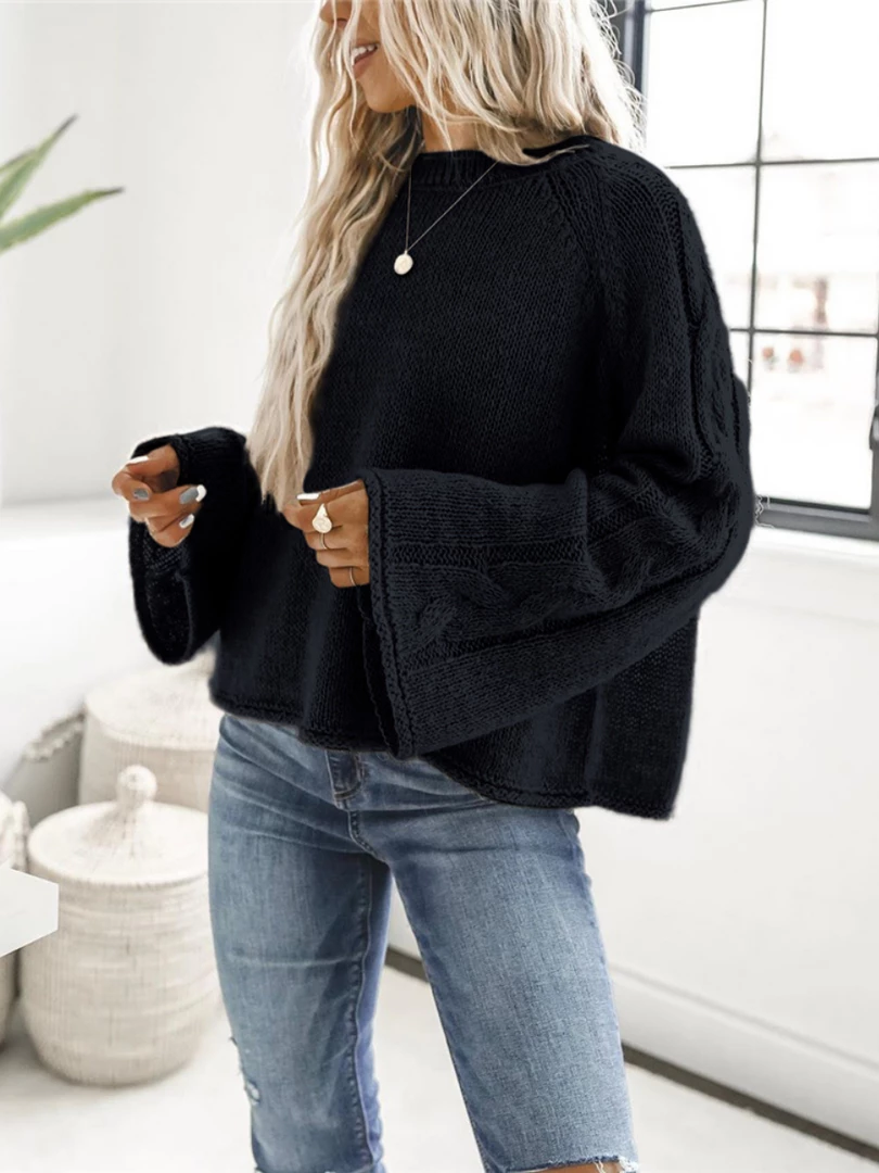 Our Phyllis Knit comes in a deep black tone. It features a round neckline, long relaxed sector shaped sleeves, and a textured knit pattern down all over the sleeves. This knit is perfect for layering during the cold winter months!
