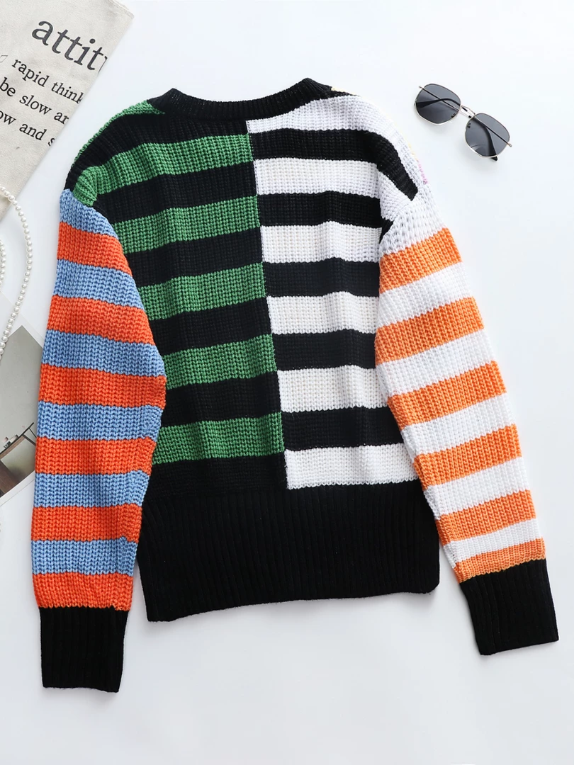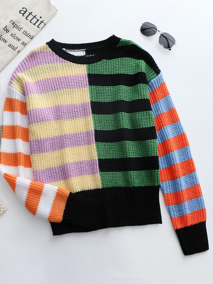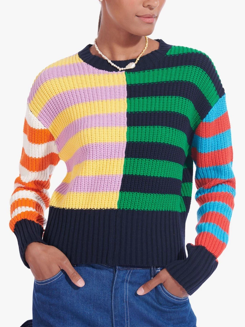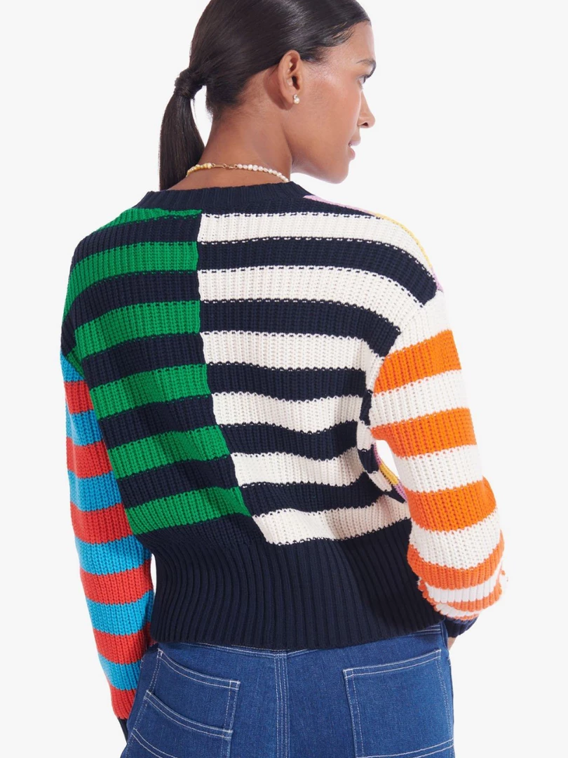 Our Roberta Knit comes in a multi stripe print, multicoloured tone. It features a scoop neckline and long straight sleeves for a relaxed, comfortable fit. Pair this cute knit with a pair of our pants and sandals for a neat retro look!