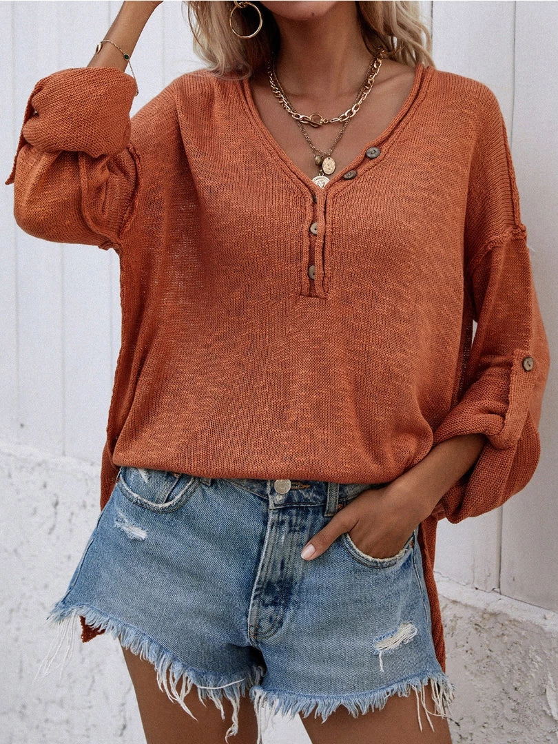 Boasting a V neckline and breezy roll sleeves, this knit top lends easy style to your wardrobe basics with it’s long back tail design.