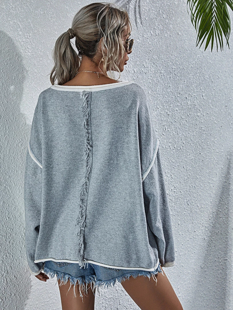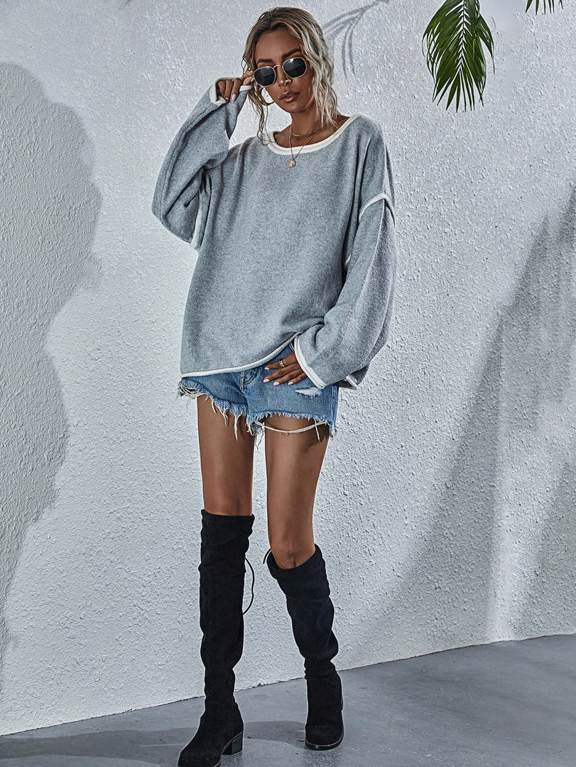 Our Stephanie Jumper comes in a soft ash tone base, with a white tone trim. It features a widen round neckline and oversized long sleeves for a comfortable, relaxed fit. This jumper is sure to keep you warm and fabulous during the cool winter months!