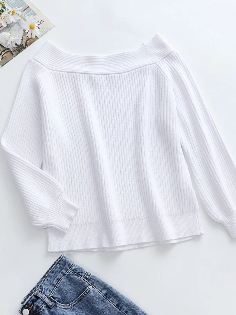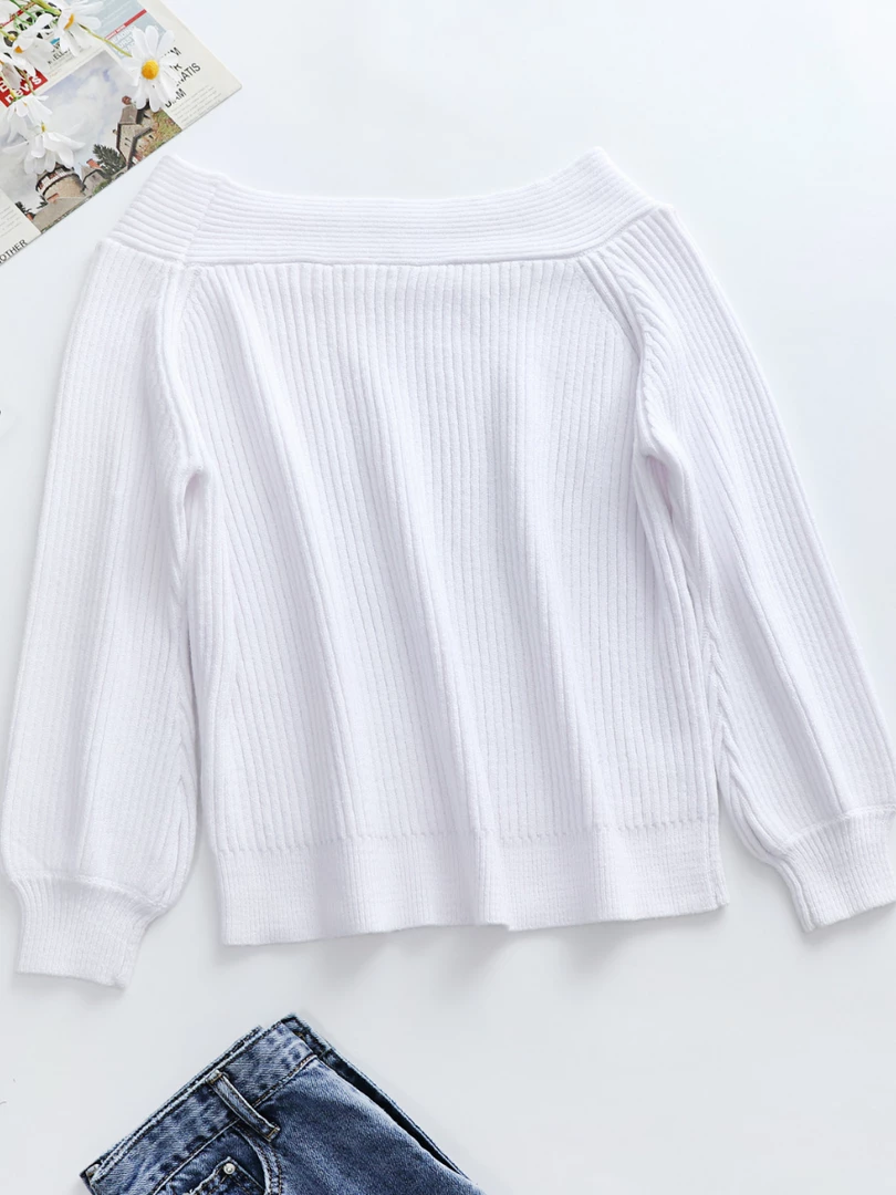 Liven up your knitwear collection with this off-shoulder sweater, designed to charm with a neutral-tone solid color and retro-cool bell sleeves.