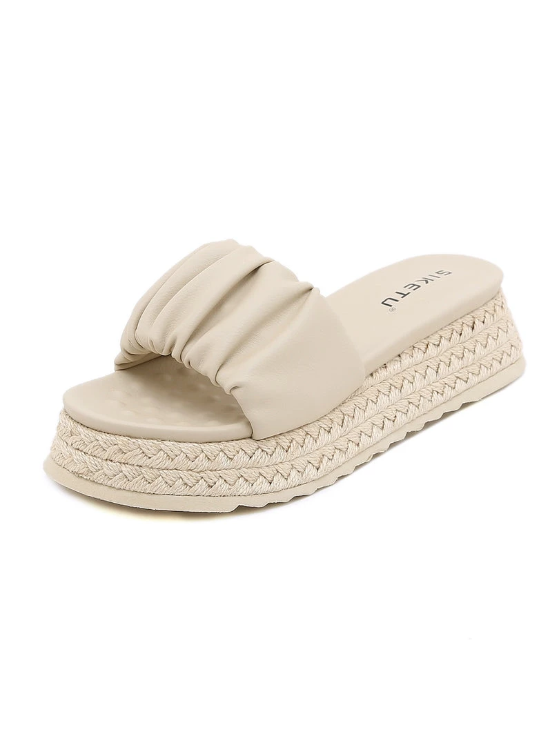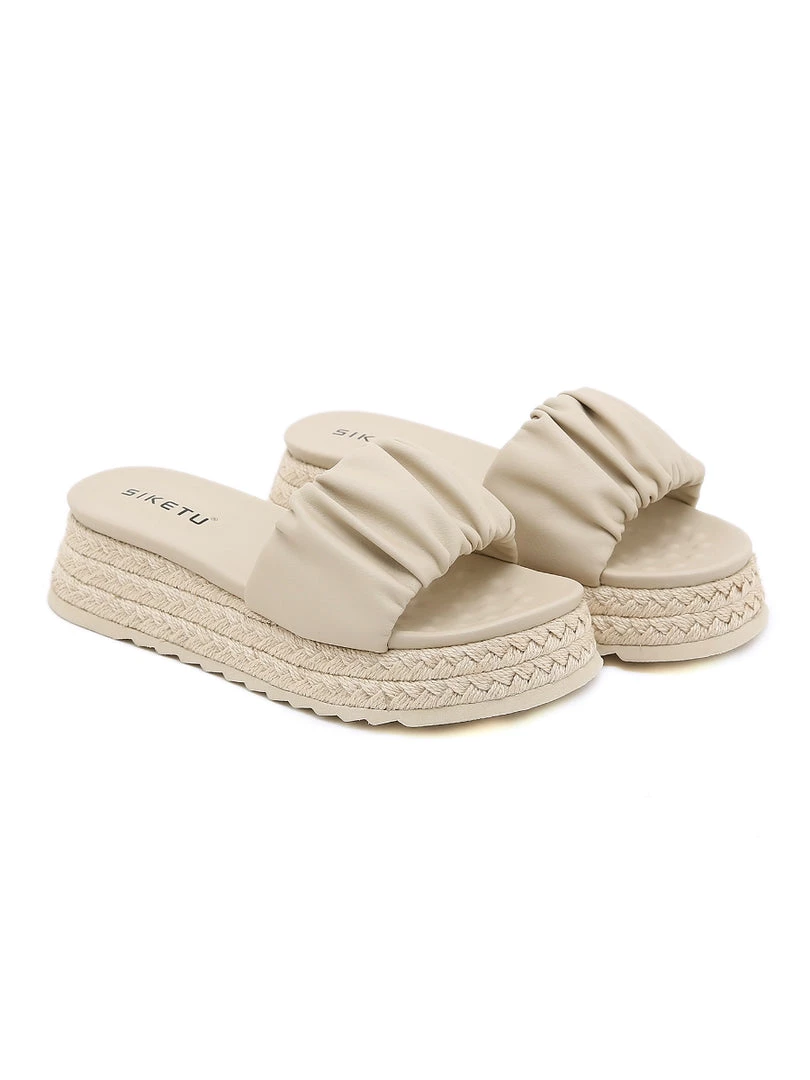 Stock up on warm-weather footwear essentials with this pair of sandals featuring an eye-catching ruched design and espadrille featured platform.