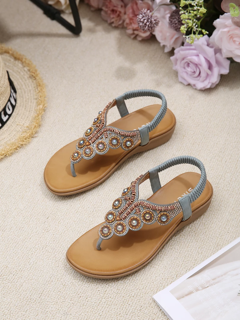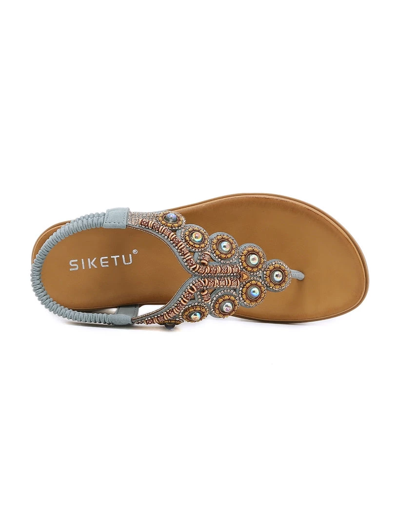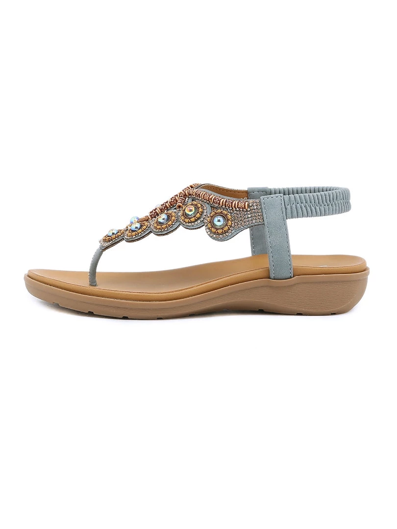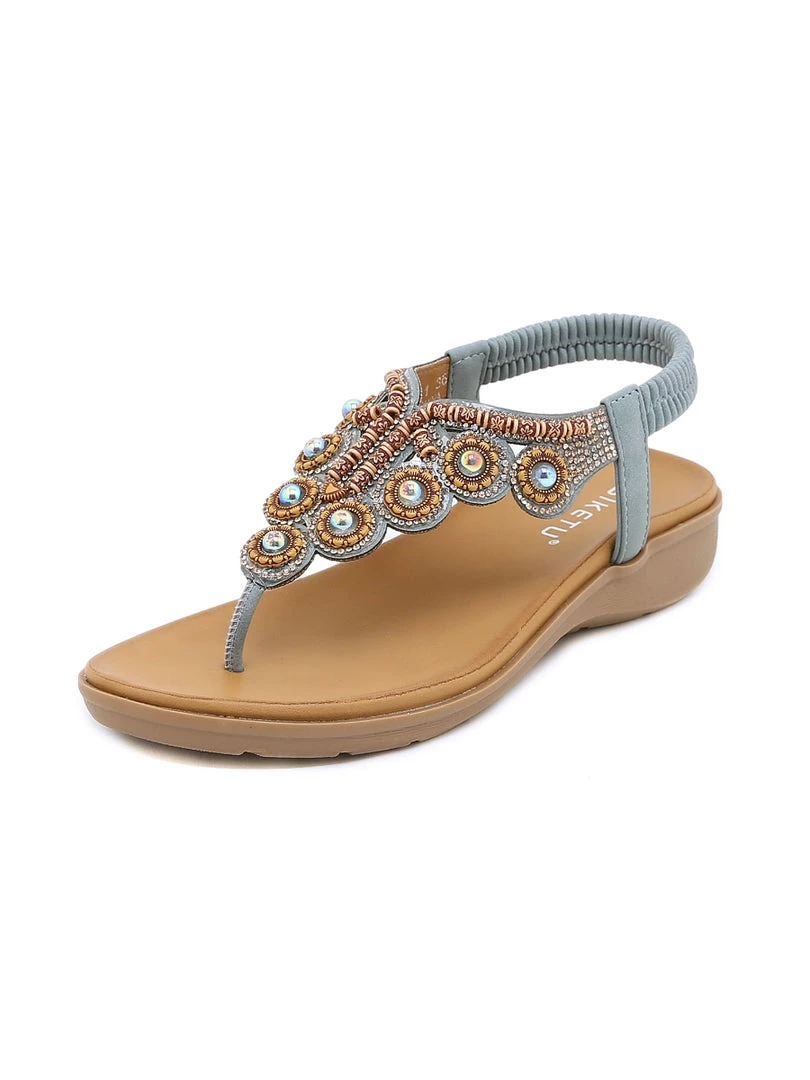 Add eye-catching detail to ensembles with the bold embellished straps of these comfort bed sandals featuring boho inspired design. An anti-skid lightweight sole provides ground-gripping traction.
