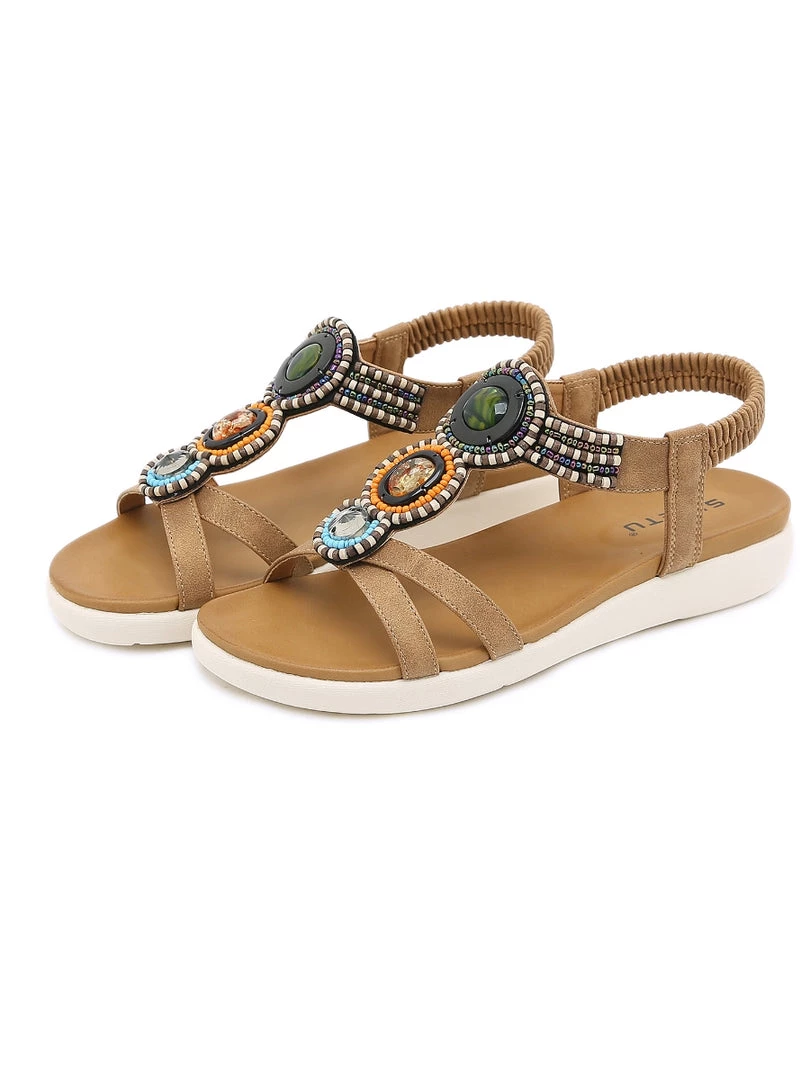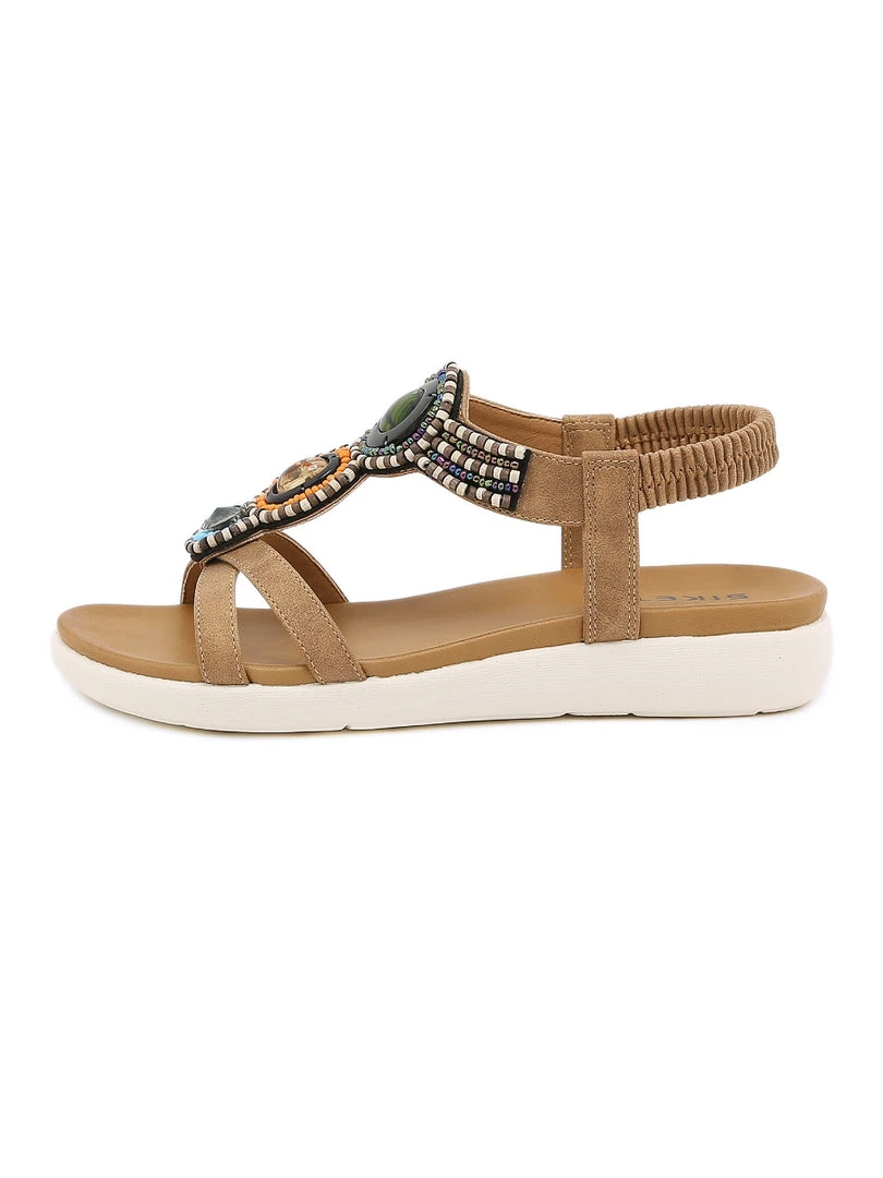 Add eye-catching detail to ensembles with the bold embellished straps of these comfortable sandals. An anti-skid lightweight sole provides ground-gripping traction.